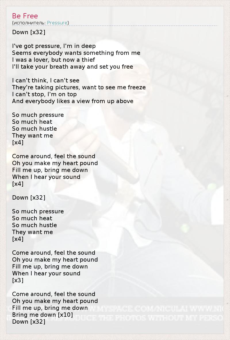 Down [x32] I've got pressure, I'm in deep Seems everybody wants something from me I was a lover, but now a thief I'll take your breath away and set you free I can't think, I can't see They're taking pictures, want to see me freeze I can't stop, I'm on top And everybody likes a view from up above So much pressure So much heat So much hustle They want me [x4] Come around, feel the sound Oh you make my heart pound Fill me up, bring me down When I hear your sound [x4] Down [x32] So much pressure So much heat So much hustle They want me [x4] Come around, feel the sound Oh you make my heart pound Fill me up, bring me down When I hear your sound [x3] Come around, feel the sound Oh you make my heart pound Fill me up, bring me down Bring me down [x10] Down [x32]