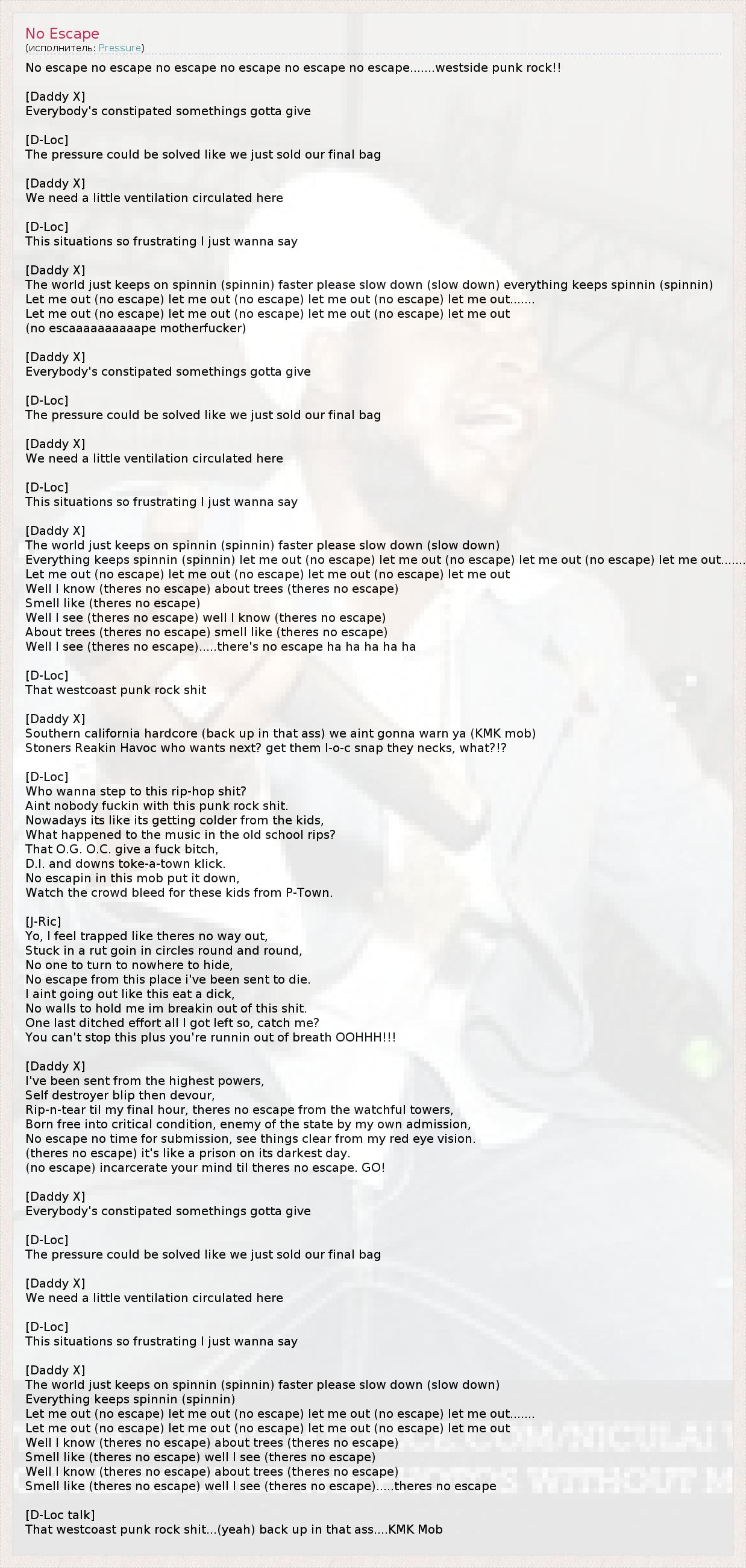 No escape no escape no escape no escape no escape no escape.......westside punk rock!! [Daddy X] Everybody's constipated somethings gotta give [D-Loc] The pressure could be solved like we just sold our final bag [Daddy X] We need a little ventilation circulated here [D-Loc] This situations so frustrating I just wanna say [Daddy X] The world just keeps on spinnin (spinnin) faster please slow down (slow down) everything keeps spinnin (spinnin) Let me out (no escape) let me out (no escape) let me out (no escape) let me out....... Let me out (no escape) let me out (no escape) let me out (no escape) let me out (no escaaaaaaaaaape motherfucker) [Daddy X] Everybody's constipated somethings gotta give [D-Loc] The pressure could be solved like we just sold our final bag [Daddy X] We need a little ventilation circulated here [D-Loc] This situations so frustrating I just wanna say [Daddy X] The world just keeps on spinnin (spinnin) faster please slow down (slow down) Everything keeps spinnin (spinnin) let me out (no escape) let me out (no escape) let me out (no escape) let me out....... Let me out (no escape) let me out (no escape) let me out (no escape) let me out Well I know (theres no escape) about trees (theres no escape) Smell like (theres no escape) Well I see (theres no escape) well I know (theres no escape) About trees (theres no escape) smell like (theres no escape) Well I see (theres no escape).....there's no escape ha ha ha ha ha [D-Loc] That westcoast punk rock shit [Daddy X] Southern california hardcore (back up in that ass) we aint gonna warn ya (KMK mob) Stoners Reakin Havoc who wants next? get them l-o-c snap they necks, what?!? [D-Loc] Who wanna step to this rip-hop shit? Aint nobody fuckin with this punk rock shit. Nowadays its like its getting colder from the kids, What happened to the music in the old school rips? That O.G. O.C. give a fuck bitch, D.I. and downs toke-a-town klick. No escapin in this mob put it down, Watch the crowd bleed for these kids from P-Town. [J-Ric] Yo, I feel trapped like theres no way out, Stuck in a rut goin in circles round and round, No one to turn to nowhere to hide, No escape from this place i've been sent to die. I aint going out like this eat a dick, No walls to hold me im breakin out of this shit. One last ditched effort all I got left so, catch me? You can't stop this plus you're runnin out of breath OOHHH!!! [Daddy X] I've been sent from the highest powers, Self destroyer blip then devour, Rip-n-tear til my final hour, theres no escape from the watchful towers, Born free into critical condition, enemy of the state by my own admission, No escape no time for submission, see things clear from my red eye vision. (theres no escape) it's like a prison on its darkest day. (no escape) incarcerate your mind til theres no escape. GO! [Daddy X] Everybody's constipated somethings gotta give [D-Loc] The pressure could be solved like we just sold our final bag [Daddy X] We need a little ventilation circulated here [D-Loc] This situations so frustrating I just wanna say [Daddy X] The world just keeps on spinnin (spinnin) faster please slow down (slow down) Everything keeps spinnin (spinnin) Let me out (no escape) let me out (no escape) let me out (no escape) let me out....... Let me out (no escape) let me out (no escape) let me out (no escape) let me out Well I know (theres no escape) about trees (theres no escape) Smell like (theres no escape) well I see (theres no escape) Well I know (theres no escape) about trees (theres no escape) Smell like (theres no escape) well I see (theres no escape).....theres no escape [D-Loc talk] That westcoast punk rock shit...(yeah) back up in that ass....KMK Mob