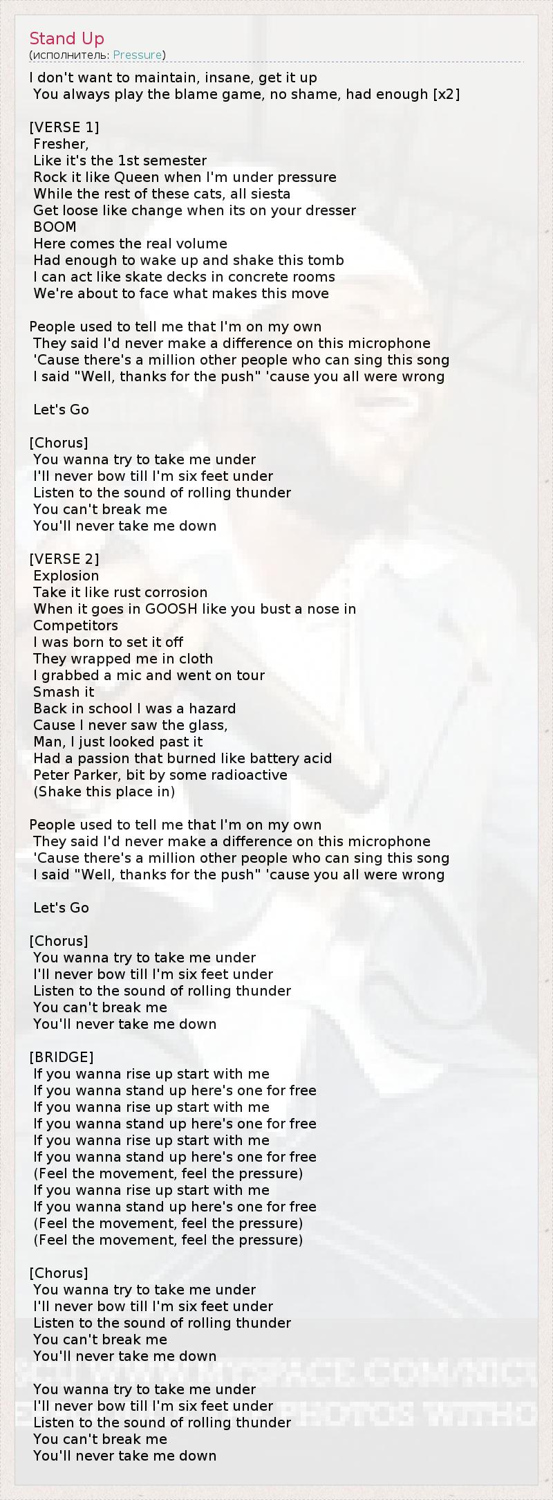 I don't want to maintain, insane, get it up You always play the blame game, no shame, had enough [x2] [VERSE 1] Fresher, Like it's the 1st semester Rock it like Queen when I'm under pressure While the rest of these cats, all siesta Get loose like change when its on your dresser BOOM Here comes the real volume Had enough to wake up and shake this tomb I can act like skate decks in concrete rooms We're about to face what makes this move People used to tell me that I'm on my own They said I'd never make a difference on this microphone 'Cause there's a million other people who can sing this song I said "Well, thanks for the push" 'cause you all were wrong Let's Go [Chorus] You wanna try to take me under I'll never bow till I'm six feet under Listen to the sound of rolling thunder You can't break me You'll never take me down [VERSE 2] Explosion Take it like rust corrosion When it goes in GOOSH like you bust a nose in Competitors I was born to set it off They wrapped me in cloth I grabbed a mic and went on tour Smash it Back in school I was a hazard Cause I never saw the glass, Man, I just looked past it Had a passion that burned like battery acid Peter Parker, bit by some radioactive (Shake this place in) People used to tell me that I'm on my own They said I'd never make a difference on this microphone 'Cause there's a million other people who can sing this song I said "Well, thanks for the push" 'cause you all were wrong Let's Go [Chorus] You wanna try to take me under I'll never bow till I'm six feet under Listen to the sound of rolling thunder You can't break me You'll never take me down [BRIDGE] If you wanna rise up start with me If you wanna stand up here's one for free If you wanna rise up start with me If you wanna stand up here's one for free If you wanna rise up start with me If you wanna stand up here's one for free (Feel the movement, feel the pressure) If you wanna rise up start with me If you wanna stand up here's one for free (Feel the movement, feel the pressure) (Feel the movement, feel the pressure) [Chorus] You wanna try to take me under I'll never bow till I'm six feet under Listen to the sound of rolling thunder You can't break me You'll never take me down You wanna try to take me under I'll never bow till I'm six feet under Listen to the sound of rolling thunder You can't break me You'll never take me down