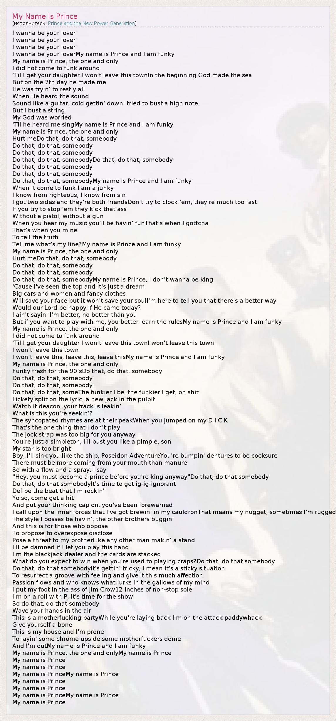 I wanna be your lover I wanna be your lover I wanna be your lover I wanna be your loverMy name is Prince and I am funky My name is Prince, the one and only I did not come to funk around 'Til I get your daughter I won't leave this townIn the beginning God made the sea But on the 7th day he made me He was tryin' to rest y'all When He heard the sound Sound like a guitar, cold gettin' downI tried to bust a high note But I bust a string My God was worried 'Til he heard me singMy name is Prince and I am funky My name is Prince, the one and only Hurt meDo that, do that, somebody Do that, do that, somebody Do that, do that, somebody Do that, do that, somebodyDo that, do that, somebody Do that, do that, somebody Do that, do that, somebody Do that, do that, somebodyMy name is Prince and I am funky When it come to funk I am a junky I know from righteous, I know from sin I got two sides and they're both friendsDon't try to clock 'em, they're much too fast If you try to stop 'em they kick that ass Without a pistol, without a gun When you hear my music you'll be havin' funThat's when I gottcha That's when you mine To tell the truth Tell me what's my line?My name is Prince and I am funky My name is Prince, the one and only Hurt meDo that, do that, somebody Do that, do that, somebody Do that, do that, somebody Do that, do that, somebodyMy name is Prince, I don't wanna be king 'Cause I've seen the top and it's just a dream Big cars and women and fancy clothes Will save your face but it won't save your soulI'm here to tell you that there's a better way Would our Lord be happy if He came today? I ain't sayin' I'm better, no better than you But if you want to play with me, you better learn the rulesMy name is Prince and I am funky My name is Prince, the one and only I did not come to funk around 'Til I get your daughter I won't leave this townI won't leave this town I won't leave this town I won't leave this, leave this, leave thisMy name is Prince and I am funky My name is Prince, the one and only Funky fresh for the 90'sDo that, do that, somebody Do that, do that, somebody Do that, do that, somebody Do that, do that, someThe funkier I be, the funkier I get, oh shit Lickety split on the lyric, a new jack in the pulpit Watch it deacon, your track is leakin' What is this you're seekin'? The syncopated rhymes are at their peakWhen you jumped on my D I C K That's the one thing that I don't play The jock strap was too big for you anyway You're just a simpleton, I'll bust you like a pimple, son My star is too bright Boy, I'll sink you like the ship, Poseidon AdventureYou're bumpin' dentures to be cocksure There must be more coming from your mouth than manure So with a flow and a spray, I say "Hey, you must become a prince before you're king anyway"Do that, do that somebody Do that, do that somebodyIt's time to get ig-ig-ignorant Def be the beat that I'm rockin' Yo so, come get a hit And put your thinking cap on, you've been forewarned I call upon the inner forces that I've got brewin' in my cauldronThat means my nugget, sometimes I'm rugged The style I posses be havin', the other brothers buggin' And this is for those who oppose To propose to overexpose disclose Pose a threat to my brotherLike any other man makin' a stand I'll be damned if I let you play this hand I'm the blackjack dealer and the cards are stacked What do you expect to win when you're used to playing craps?Do that, do that somebody Do that, do that somebodyIt's gettin' tricky, I mean it's a sticky situation To resurrect a groove with feeling and give it this much affection Passion flows and who knows what lurks in the gallows of my mind I put my foot in the ass of Jim Crow12 inches of non-stop sole I'm on a roll with P, it's time for the show So do that, do that somebody Wave your hands in the air This is a motherfucking partyWhile you're laying back I'm on the attack paddywhack Give yourself a bone This is my house and I'm prone To layin' some chrome upside some motherfuckers dome And I'm outMy name is Prince and I am funky My name is Prince, the one and onlyMy name is Prince My name is Prince My name is Prince My name is PrinceMy name is Prince My name is Prince My name is Prince My name is PrinceMy name is Prince My name is Prince