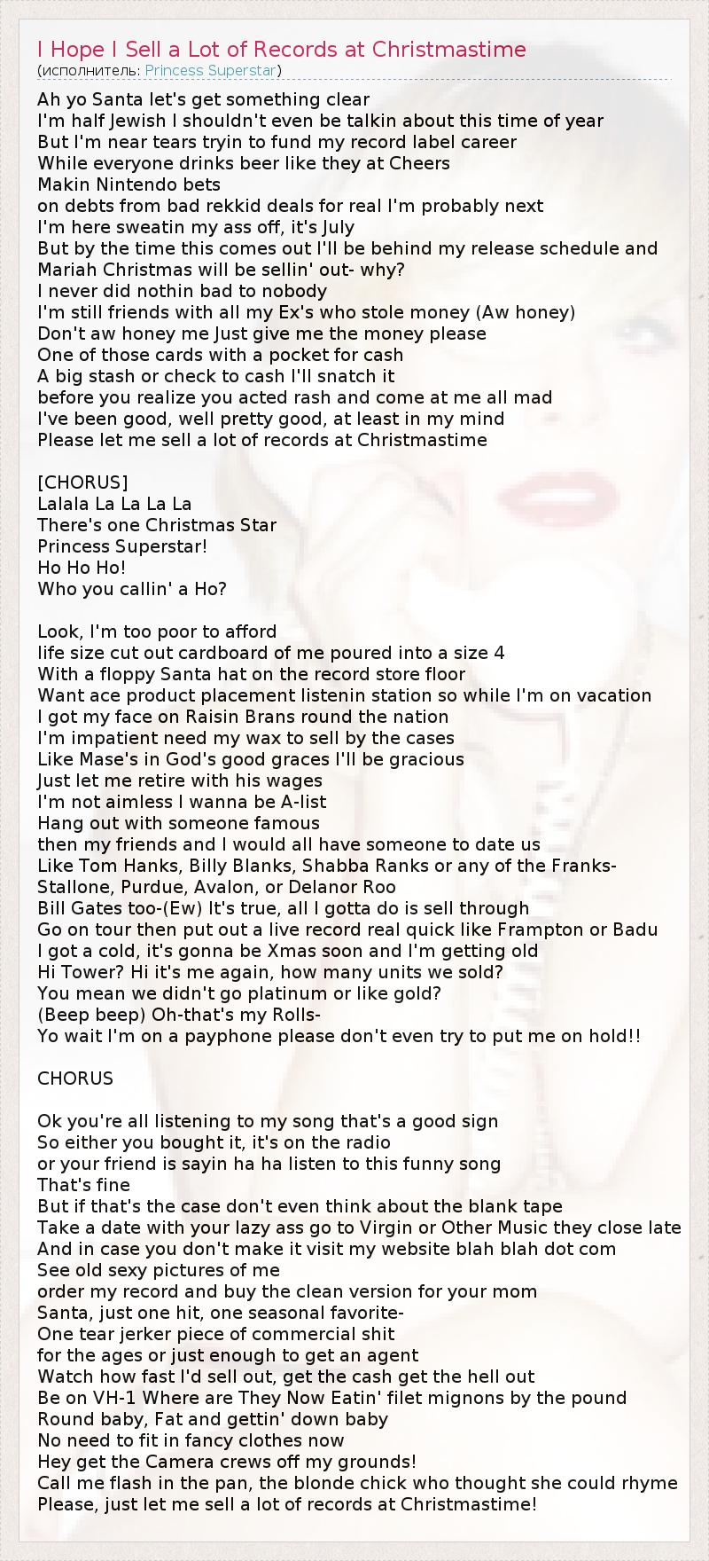 ГлавнаяИсполнителиPrincess SuperstarI Hope I Sell a Lot of Records at Christmastime