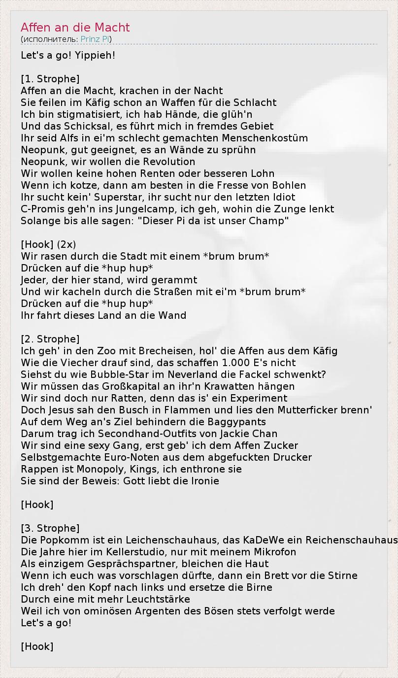 Let's a go! Yippieh! [1. Strophe] Affen an die Macht, krachen in der Nacht Sie feilen im Käfig schon an Waffen für die Schlacht Ich bin stigmatisiert, ich hab Hände, die glüh'n Und das Schicksal, es führt mich in fremdes Gebiet Ihr seid Alfs in ei'm schlecht gemachten Menschenkostüm Neopunk, gut geeignet, es an Wände zu sprühn Neopunk, wir wollen die Revolution Wir wollen keine hohen Renten oder besseren Lohn Wenn ich kotze, dann am besten in die Fresse von Bohlen Ihr sucht kein' Superstar, ihr sucht nur den letzten Idiot C-Promis geh'n ins Jungelcamp, ich geh, wohin die Zunge lenkt Solange bis alle sagen: "Dieser Pi da ist unser Champ" [Hook] (2x) Wir rasen durch die Stadt mit einem *brum brum* Drücken auf die *hup hup* Jeder, der hier stand, wird gerammt Und wir kacheln durch die Straßen mit ei'm *brum brum* Drücken auf die *hup hup* Ihr fahrt dieses Land an die Wand [2. Strophe] Ich geh' in den Zoo mit Brecheisen, hol' die Affen aus dem Käfig Wie die Viecher drauf sind, das schaffen 1.000 E's nicht Siehst du wie Bubble-Star im Neverland die Fackel schwenkt? Wir müssen das Großkapital an ihr'n Krawatten hängen Wir sind doch nur Ratten, denn das is' ein Experiment Doch Jesus sah den Busch in Flammen und lies den Mutterficker brenn' Auf dem Weg an's Ziel behindern die Baggypants Darum trag ich Secondhand-Outfits von Jackie Chan Wir sind eine sexy Gang, erst geb' ich dem Affen Zucker Selbstgemachte Euro-Noten aus dem abgefuckten Drucker Rappen ist Monopoly, Kings, ich enthrone sie Sie sind der Beweis: Gott liebt die Ironie [Hook] [3. Strophe] Die Popkomm ist ein Leichenschauhaus, das KaDeWe ein Reichenschauhaus Die Jahre hier im Kellerstudio, nur mit meinem Mikrofon Als einzigem Gesprächspartner, bleichen die Haut Wenn ich euch was vorschlagen dürfte, dann ein Brett vor die Stirne Ich dreh' den Kopf nach links und ersetze die Birne Durch eine mit mehr Leuchtstärke Weil ich von ominösen Argenten des Bösen stets verfolgt werde Let's a go! [Hook]