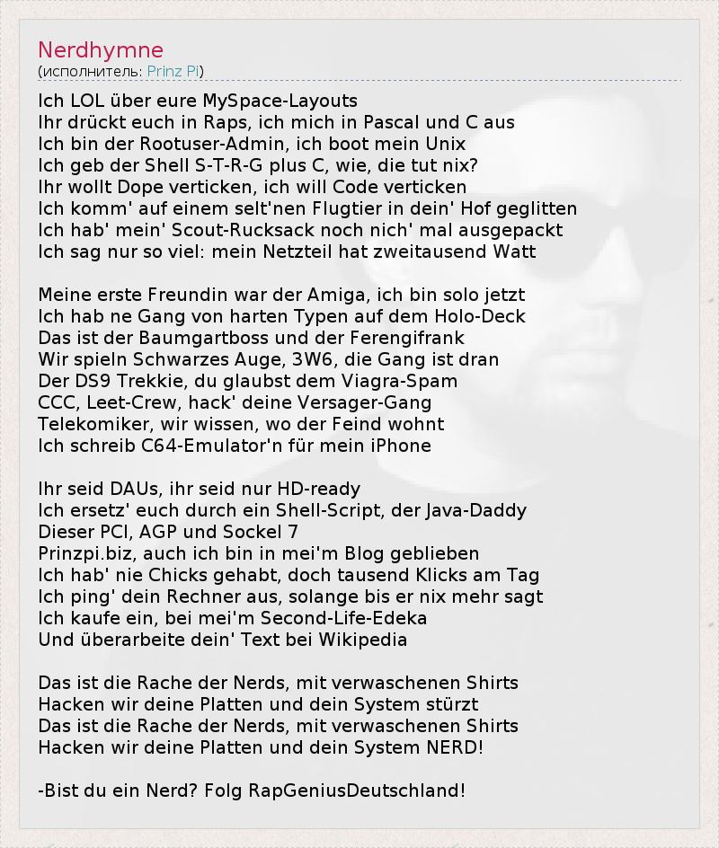 Ich LOL über eure MySpace-Layouts Ihr drückt euch in Raps, ich mich in Pascal und C aus Ich bin der Rootuser-Admin, ich boot mein Unix Ich geb der Shell S-T-R-G plus C, wie, die tut nix? Ihr wollt Dope verticken, ich will Code verticken Ich komm' auf einem selt'nen Flugtier in dein' Hof geglitten Ich hab' mein' Scout-Rucksack noch nich' mal ausgepackt Ich sag nur so viel: mein Netzteil hat zweitausend Watt Meine erste Freundin war der Amiga, ich bin solo jetzt Ich hab ne Gang von harten Typen auf dem Holo-Deck Das ist der Baumgartboss und der Ferengifrank Wir spieln Schwarzes Auge, 3W6, die Gang ist dran Der DS9 Trekkie, du glaubst dem Viagra-Spam CCC, Leet-Crew, hack' deine Versager-Gang Telekomiker, wir wissen, wo der Feind wohnt Ich schreib C64-Emulator'n für mein iPhone Ihr seid DAUs, ihr seid nur HD-ready Ich ersetz' euch durch ein Shell-Script, der Java-Daddy Dieser PCI, AGP und Sockel 7 Prinzpi.biz, auch ich bin in mei'm Blog geblieben Ich hab' nie Chicks gehabt, doch tausend Klicks am Tag Ich ping' dein Rechner aus, solange bis er nix mehr sagt Ich kaufe ein, bei mei'm Second-Life-Edeka Und überarbeite dein' Text bei Wikipedia Das ist die Rache der Nerds, mit verwaschenen Shirts Hacken wir deine Platten und dein System stürzt Das ist die Rache der Nerds, mit verwaschenen Shirts Hacken wir deine Platten und dein System NERD! -Bist du ein Nerd? Folg RapGeniusDeutschland!