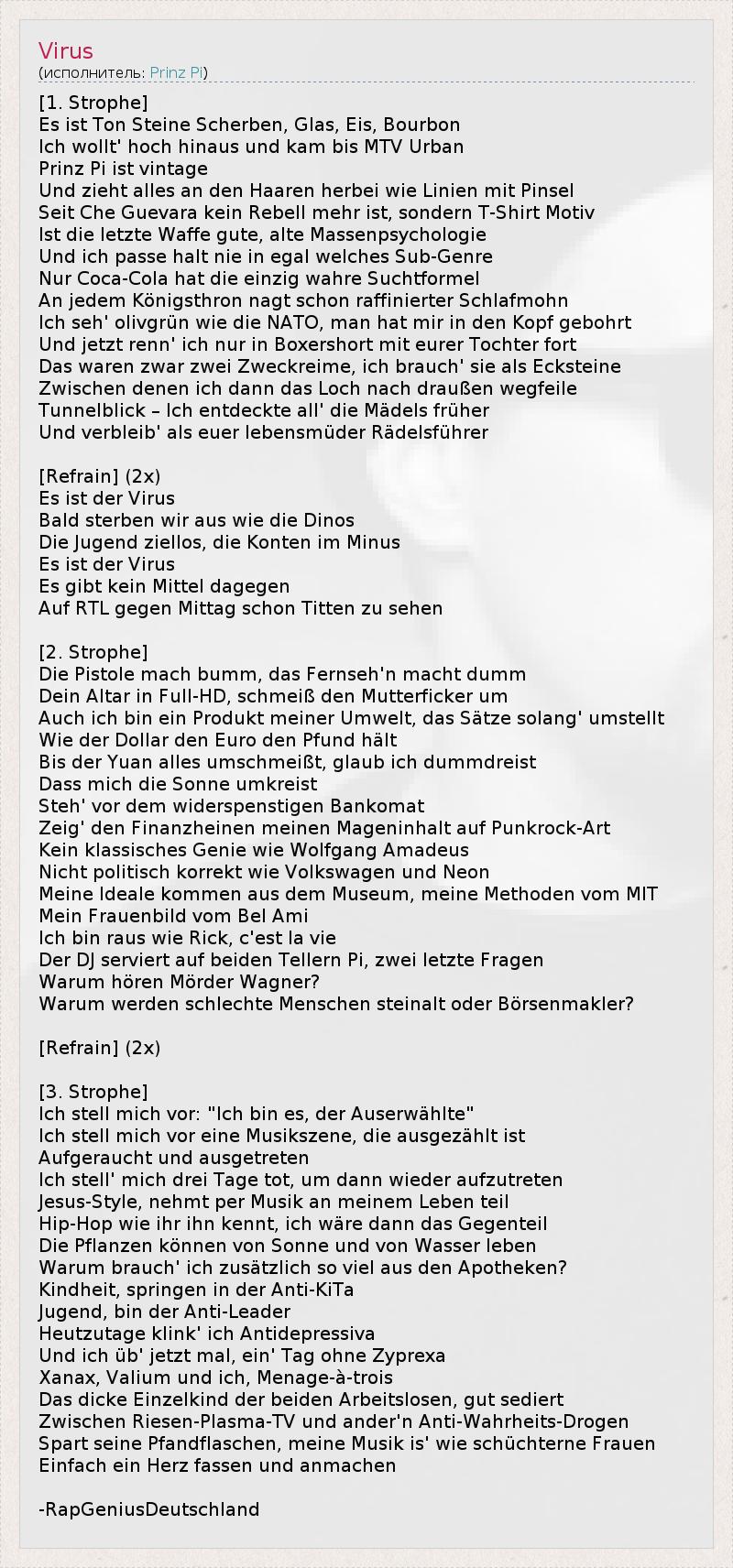 [1. Strophe] Es ist Ton Steine Scherben, Glas, Eis, Bourbon Ich wollt' hoch hinaus und kam bis MTV Urban Prinz Pi ist vintage Und zieht alles an den Haaren herbei wie Linien mit Pinsel Seit Che Guevara kein Rebell mehr ist, sondern T-Shirt Motiv Ist die letzte Waffe gute, alte Massenpsychologie Und ich passe halt nie in egal welches Sub-Genre Nur Coca-Cola hat die einzig wahre Suchtformel An jedem Königsthron nagt schon raffinierter Schlafmohn Ich seh' olivgrün wie die NATO, man hat mir in den Kopf gebohrt Und jetzt renn' ich nur in Boxershort mit eurer Tochter fort Das waren zwar zwei Zweckreime, ich brauch' sie als Ecksteine Zwischen denen ich dann das Loch nach draußen wegfeile Tunnelblick – Ich entdeckte all' die Mädels früher Und verbleib' als euer lebensmüder Rädelsführer [Refrain] (2x) Es ist der Virus Bald sterben wir aus wie die Dinos Die Jugend ziellos, die Konten im Minus Es ist der Virus Es gibt kein Mittel dagegen Auf RTL gegen Mittag schon Titten zu sehen [2. Strophe] Die Pistole mach bumm, das Fernseh'n macht dumm Dein Altar in Full-HD, schmeiß den Mutterficker um Auch ich bin ein Produkt meiner Umwelt, das Sätze solang' umstellt Wie der Dollar den Euro den Pfund hält Bis der Yuan alles umschmeißt, glaub ich dummdreist Dass mich die Sonne umkreist Steh' vor dem widerspenstigen Bankomat Zeig' den Finanzheinen meinen Mageninhalt auf Punkrock-Art Kein klassisches Genie wie Wolfgang Amadeus Nicht politisch korrekt wie Volkswagen und Neon Meine Ideale kommen aus dem Museum, meine Methoden vom MIT Mein Frauenbild vom Bel Ami Ich bin raus wie Rick, c'est la vie Der DJ serviert auf beiden Tellern Pi, zwei letzte Fragen Warum hören Mörder Wagner? Warum werden schlechte Menschen steinalt oder Börsenmakler? [Refrain] (2x) [3. Strophe] Ich stell mich vor: "Ich bin es, der Auserwählte" Ich stell mich vor eine Musikszene, die ausgezählt ist Aufgeraucht und ausgetreten Ich stell' mich drei Tage tot, um dann wieder aufzutreten Jesus-Style, nehmt per Musik an meinem Leben teil Hip-Hop wie ihr ihn kennt, ich wäre dann das Gegenteil Die Pflanzen können von Sonne und von Wasser leben Warum brauch' ich zusätzlich so viel aus den Apotheken? Kindheit, springen in der Anti-KiTa Jugend, bin der Anti-Leader Heutzutage klink' ich Antidepressiva Und ich üb' jetzt mal, ein' Tag ohne Zyprexa Xanax, Valium und ich, Menage-à-trois Das dicke Einzelkind der beiden Arbeitslosen, gut sediert Zwischen Riesen-Plasma-TV und ander'n Anti-Wahrheits-Drogen Spart seine Pfandflaschen, meine Musik is' wie schüchterne Frauen Einfach ein Herz fassen und anmachen -RapGeniusDeutschland