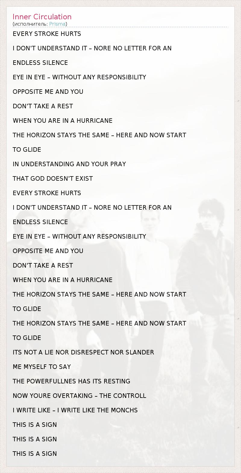 EVERY STROKE HURTS I DON'T UNDERSTAND IT – NORE NO LETTER FOR AN ENDLESS SILENCE EYE IN EYE – WITHOUT ANY RESPONSIBILITY OPPOSITE ME AND YOU DON'T TAKE A REST WHEN YOU ARE IN A HURRICANE THE HORIZON STAYS THE SAME – HERE AND NOW START TO GLIDE IN UNDERSTANDING AND YOUR PRAY THAT GOD DOESN'T EXIST EVERY STROKE HURTS I DON'T UNDERSTAND IT – NORE NO LETTER FOR AN ENDLESS SILENCE EYE IN EYE – WITHOUT ANY RESPONSIBILITY OPPOSITE ME AND YOU DON'T TAKE A REST WHEN YOU ARE IN A HURRICANE THE HORIZON STAYS THE SAME – HERE AND NOW START TO GLIDE THE HORIZON STAYS THE SAME – HERE AND NOW START TO GLIDE ITS NOT A LIE NOR DISRESPECT NOR SLANDER ME MYSELF TO SAY THE POWERFULLNES HAS ITS RESTING NOW YOURE OVERTAKING – THE CONTROLL I WRITE LIKE – I WRITE LIKE THE MONCHS THIS IS A SIGN THIS IS A SIGN THIS IS A SIGN
