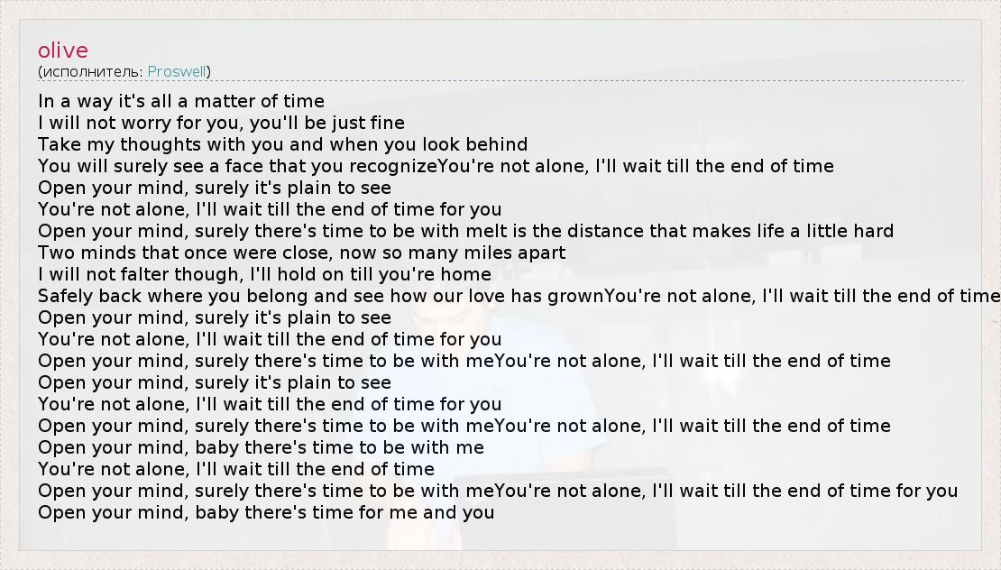 Open your mind, surely there's time to be with meYou're not alone, I'll wait till the end of time