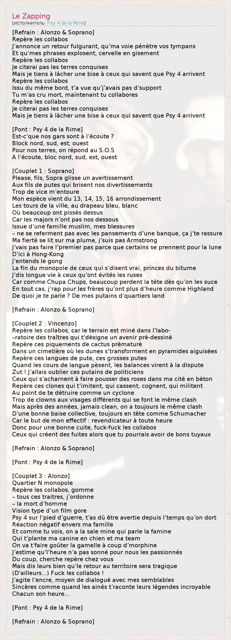 Это интересно:Psy 4 De La Rime — Марсельская рэп-группа. Была образована в 1995 году и сначала имела название KDB (Kid Dog Black). В её состав входят: Soprano, Segnor Alonzo, Don Vincenzo, и Dj Sya Styles.Альбомы * 2002: Block Party * 2005: De La Lune * 2008: Les Cit’s D’orСсылкиhttp://psy4-delarime.artistes.universalmusic.fr/ - официальный сайт группыhttp://www.psy4tra.fr/... продолжение
