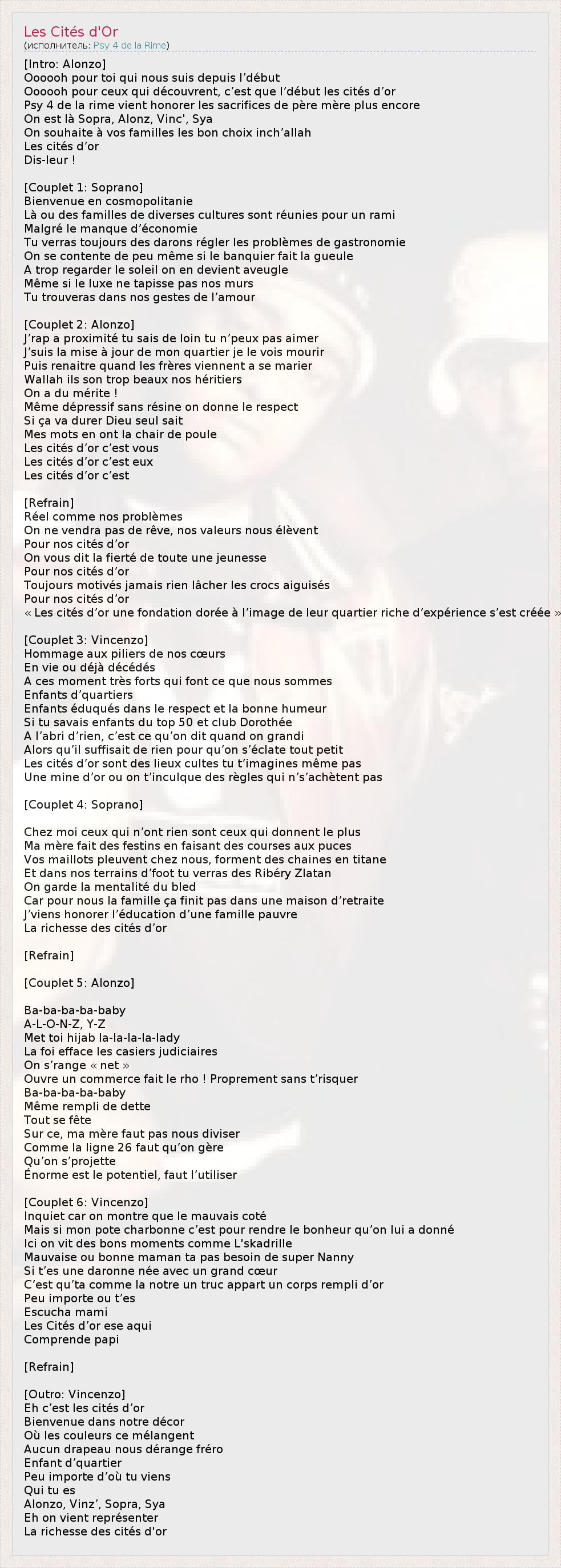 Это интересно:Psy 4 De La Rime — Марсельская рэп-группа. Была образована в 1995 году и сначала имела название KDB (Kid Dog Black). В её состав входят: Soprano, Segnor Alonzo, Don Vincenzo, и Dj Sya Styles.Альбомы * 2002: Block Party * 2005: De La Lune * 2008: Les Cit’s D’orСсылкиhttp://psy4-delarime.artistes.universalmusic.fr/ - официальный сайт группыhttp://www.psy4tra.fr/... продолжение