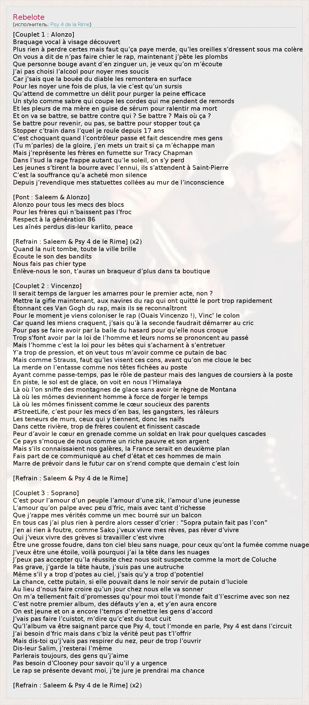 Это интересно:Psy 4 De La Rime — Марсельская рэп-группа. Была образована в 1995 году и сначала имела название KDB (Kid Dog Black). В её состав входят: Soprano, Segnor Alonzo, Don Vincenzo, и Dj Sya Styles.Альбомы * 2002: Block Party * 2005: De La Lune * 2008: Les Cit’s D’orСсылкиhttp://psy4-delarime.artistes.universalmusic.fr/ - официальный сайт группыhttp://www.psy4tra.fr/... продолжение