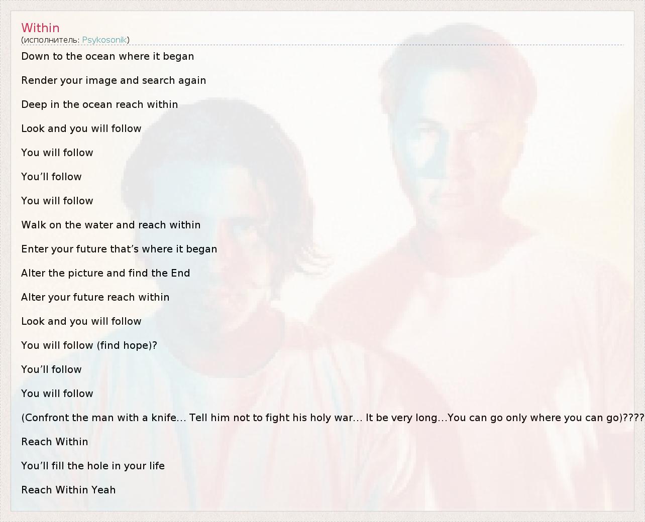 Down to the ocean where it began Render your image and search again Deep in the ocean reach within Look and you will follow You will follow You’ll follow You will follow Walk on the water and reach within Enter your future that’s where it began Alter the picture and find the End Alter your future reach within Look and you will follow You will follow (find hope)? You’ll follow You will follow (Confront the man with a knife… Tell him not to fight his holy war… It be very long…You can go only where you can go)???? Reach Within You’ll fill the hole in your life Reach Within Yeah