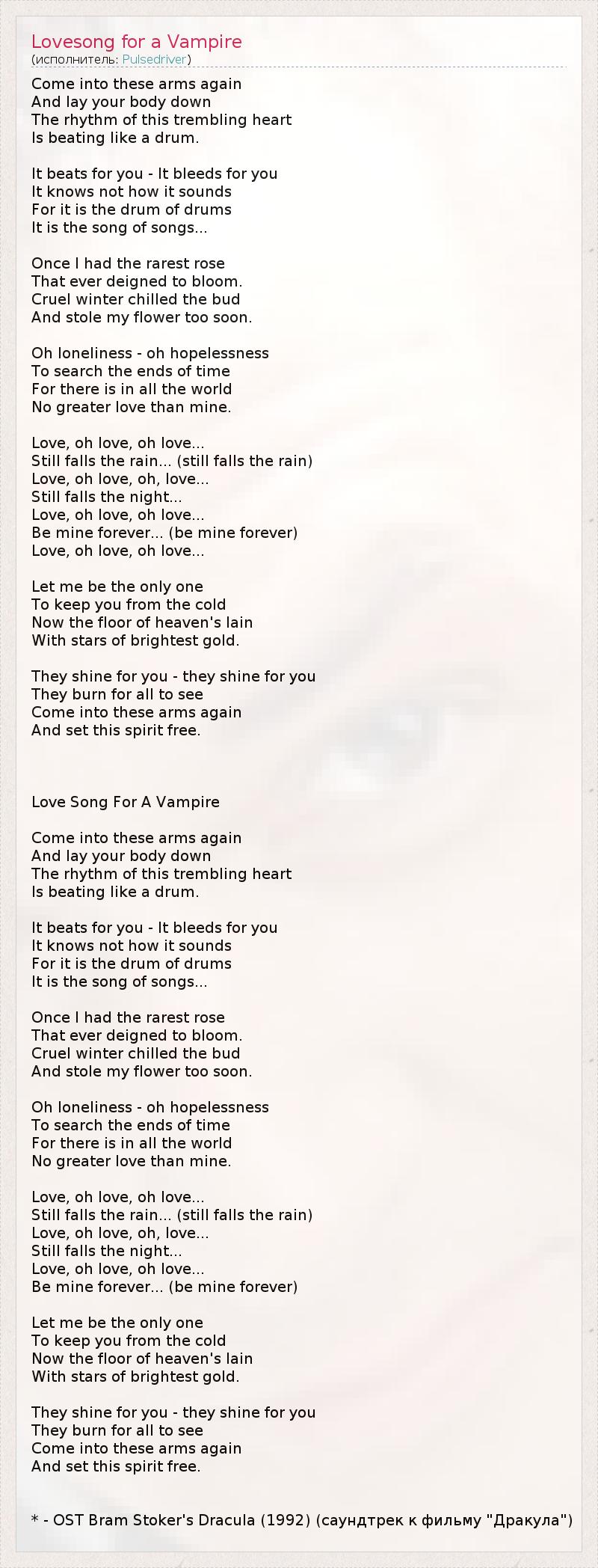 Come into these arms again And lay your body down The rhythm of this trembling heart Is beating like a drum. It beats for you - It bleeds for you It knows not how it sounds For it is the drum of drums It is the song of songs... Once I had the rarest rose That ever deigned to bloom. Cruel winter chilled the bud And stole my flower too soon. Oh loneliness - oh hopelessness To search the ends of time For there is in all the world No greater love than mine. Love, oh love, oh love... Still falls the rain... (still falls the rain) Love, oh love, oh, love... Still falls the night... Love, oh love, oh love... Be mine forever... (be mine forever) Love, oh love, oh love... Let me be the only one To keep you from the cold Now the floor of heaven's lain With stars of brightest gold. They shine for you - they shine for you They burn for all to see Come into these arms again And set this spirit free. Love Song For A Vampire Come into these arms again And lay your body down The rhythm of this trembling heart Is beating like a drum. It beats for you - It bleeds for you It knows not how it sounds For it is the drum of drums It is the song of songs... Once I had the rarest rose That ever deigned to bloom. Cruel winter chilled the bud And stole my flower too soon. Oh loneliness - oh hopelessness To search the ends of time For there is in all the world No greater love than mine. Love, oh love, oh love... Still falls the rain... (still falls the rain) Love, oh love, oh, love... Still falls the night... Love, oh love, oh love... Be mine forever... (be mine forever) Let me be the only one To keep you from the cold Now the floor of heaven's lain With stars of brightest gold. They shine for you - they shine for you They burn for all to see Come into these arms again And set this spirit free. * - OST Bram Stoker's Dracula (1992) (саундтрек к фильму "Дракула")