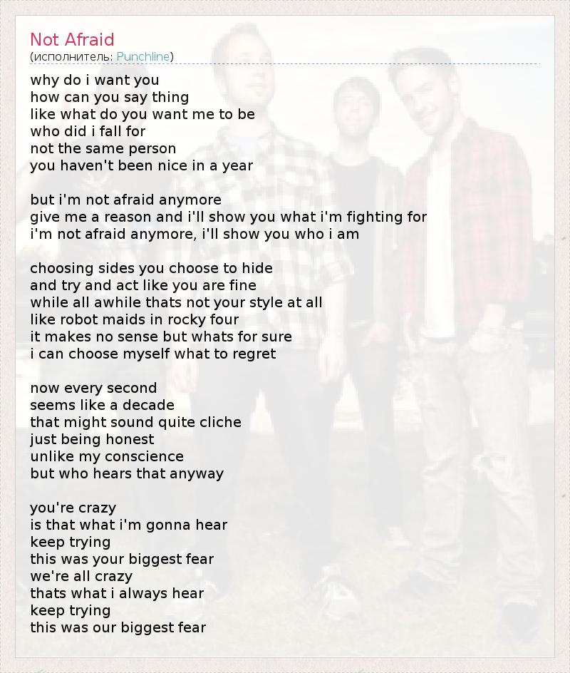 why do i want you how can you say thing like what do you want me to be who did i fall for not the same person you haven't been nice in a year but i'm not afraid anymore give me a reason and i'll show you what i'm fighting for i'm not afraid anymore, i'll show you who i am choosing sides you choose to hide and try and act like you are fine while all awhile thats not your style at all like robot maids in rocky four it makes no sense but whats for sure i can choose myself what to regret now every second seems like a decade that might sound quite cliche just being honest unlike my conscience but who hears that anyway you're crazy is that what i'm gonna hear keep trying this was your biggest fear we're all crazy thats what i always hear keep trying this was our biggest fear