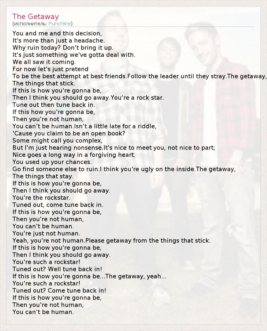 You and me and this decision, It's more than just a headache. Why ruin today? Don't bring it up. It's just something we've gotta deal with. We all saw it coming. For now let's just pretend To be the best attempt at best friends.Follow the leader until they stray.The getaway, The things that stick. If this is how you're gonna be, Then I think you should go away.You're a rock star. Tune out then tune back in. If this how you're gonna be, Then you're not human, You can't be human.Isn't a little late for a riddle, 'Cause you claim to be an open book? Some might call you complex, But I'm just hearing nonsense.It's nice to meet you, not nice to part; Nice goes a long way in a forgiving heart. You used up your chances. Go find someone else to ruin.I think you're ugly on the inside.The getaway, The things that stay. If this is how you're gonna be, Then I think you should go away. You're the rockstar. Tuned out, come tune back in. If this is how you're gonna be, Then you're not human, You can't be human. You're just not human. Yeah, you're not human.Please getaway from the things that stick. If this is how you're gonna be, Then I think you should go away. You're such a rockstar! Tuned out? Well tune back in! If this is how you're gonna be...The getaway, yeah... You're such a rockstar! Tuned out? Come tune back in! If this is how you're gonna be, Then you're not human, You can't be human.