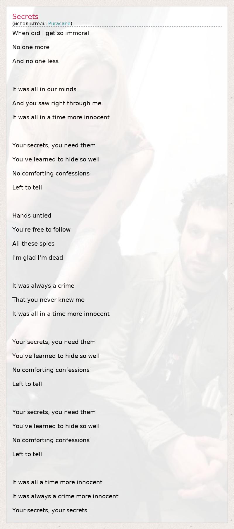 When did I get so immoral No one more And no one less It was all in our minds And you saw right through me It was all in a time more innocent Your secrets, you need them You've learned to hide so well No comforting confessions Left to tell Hands untied You're free to follow All these spies I'm glad I'm dead It was always a crime That you never knew me It was all in a time more innocent Your secrets, you need them You've learned to hide so well No comforting confessions Left to tell Your secrets, you need them You've learned to hide so well No comforting confessions Left to tell It was all a time more innocent It was always a crime more innocent Your secrets, your secrets