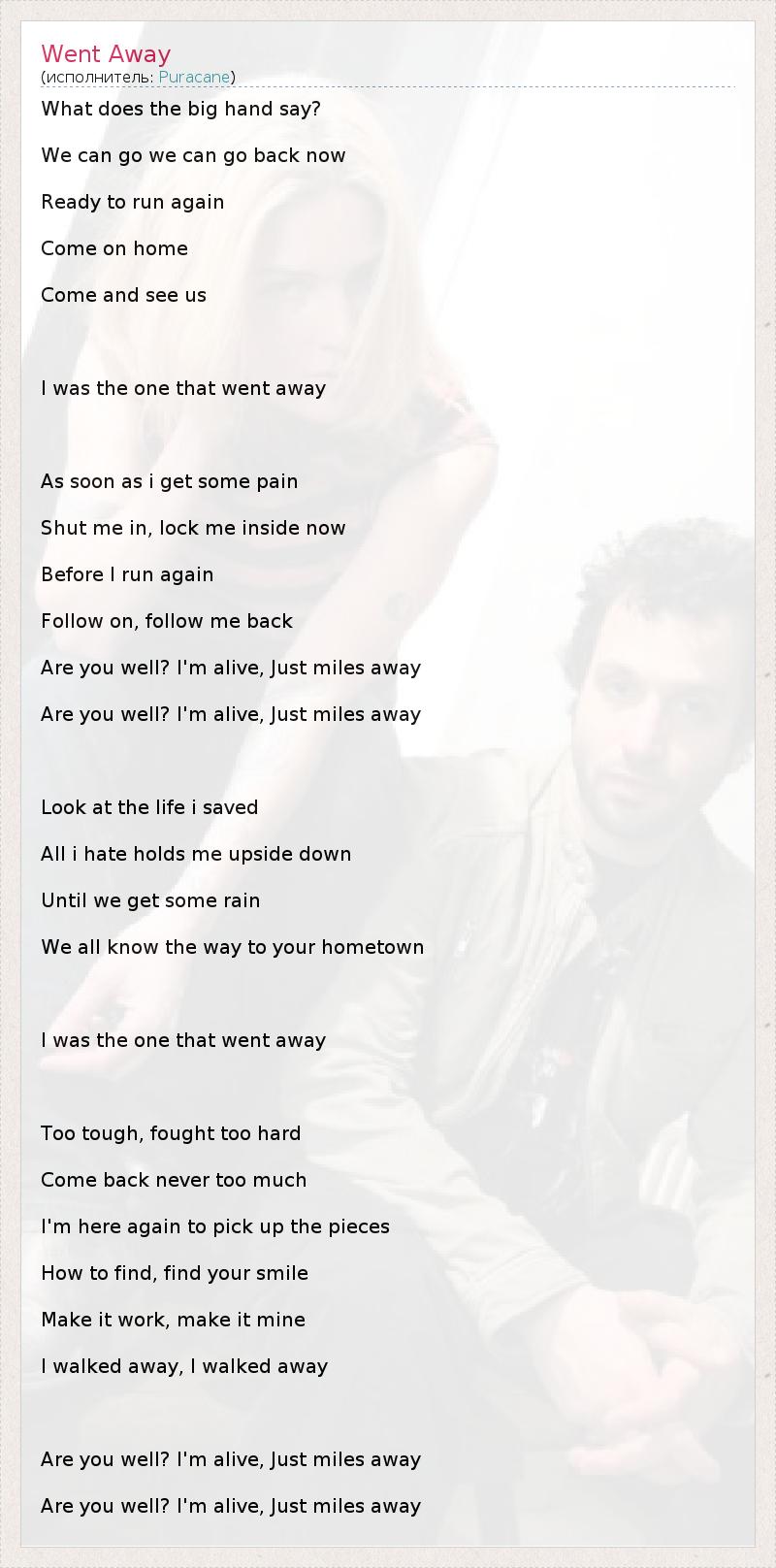 What does the big hand say? We can go we can go back now Ready to run again Come on home Come and see us I was the one that went away As soon as i get some pain Shut me in, lock me inside now Before I run again Follow on, follow me back Are you well? I'm alive, Just miles away Are you well? I'm alive, Just miles away Look at the life i saved All i hate holds me upside down Until we get some rain We all know the way to your hometown I was the one that went away Too tough, fought too hard Come back never too much I'm here again to pick up the pieces How to find, find your smile Make it work, make it mine I walked away, I walked away Are you well? I'm alive, Just miles away Are you well? I'm alive, Just miles away