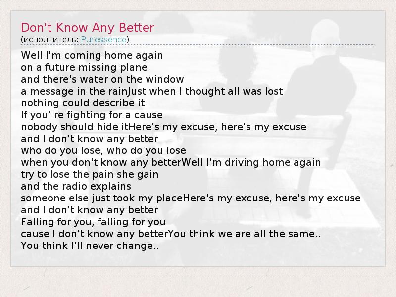 Well I'm coming home again on a future missing plane and there's water on the window a message in the rainJust when I thought all was lost nothing could describe it If you' re fighting for a cause nobody should hide itHere's my excuse, here's my excuse and I don't know any better who do you lose, who do you lose when you don't know any betterWell I'm driving home again try to lose the pain she gain and the radio explains someone else just took my placeHere's my excuse, here's my excuse and I don't know any better Falling for you, falling for you cause I don't know any betterYou think we are all the same.. You think I'll never change..