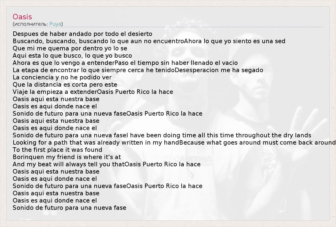 Despues de haber andado por todo el desierto Buscando, buscando, buscando lo que aun no encuentroAhora lo que yo siento es una sed Que mi me quema por dentro yo lo se Aqui esta lo que busco, lo que yo busco Ahora es que lo vengo a entenderPaso el tiempo sin haber llenado el vacio La etapa de encontrar lo que siempre cerca he tenidoDesesperacion me ha segado La conciencia y no he podido ver Que la distancia es corta pero este Viaje la empieza a extenderOasis Puerto Rico la hace Oasis aqui esta nuestra base Oasis es aqui donde nace el Sonido de futuro para una nueva faseOasis Puerto Rico la hace Oasis aqui esta nuestra base Oasis es aqui donde nace el Sonido de futuro para una nueva faseI have been doing time all this time throughout the dry lands Looking for a path that was already written in my handBecause what goes around must come back around To the first place it was found Borinquen my friend is where it's at And my beat will always tell you thatOasis Puerto Rico la hace Oasis aqui esta nuestra base Oasis es aqui donde nace el Sonido de futuro para una nueva faseOasis Puerto Rico la hace Oasis aqui esta nuestra base Oasis es aqui donde nace el Sonido de futuro para una nueva fase