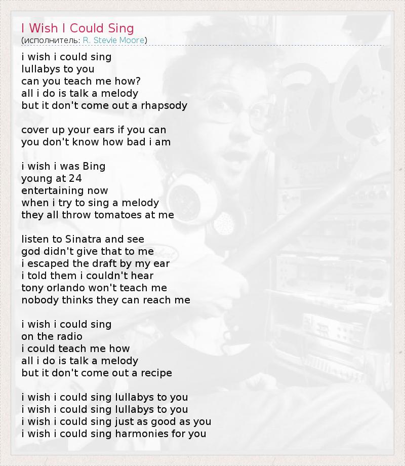 i wish i could sing lullabys to you can you teach me how? all i do is talk a melody but it don't come out a rhapsody cover up your ears if you can you don't know how bad i am i wish i was Bing young at 24 entertaining now when i try to sing a melody they all throw tomatoes at me listen to Sinatra and see god didn't give that to me i escaped the draft by my ear i told them i couldn't hear tony orlando won't teach me nobody thinks they can reach me i wish i could sing on the radio i could teach me how all i do is talk a melody but it don't come out a recipe i wish i could sing lullabys to you i wish i could sing lullabys to you i wish i could sing just as good as you i wish i could sing harmonies for you