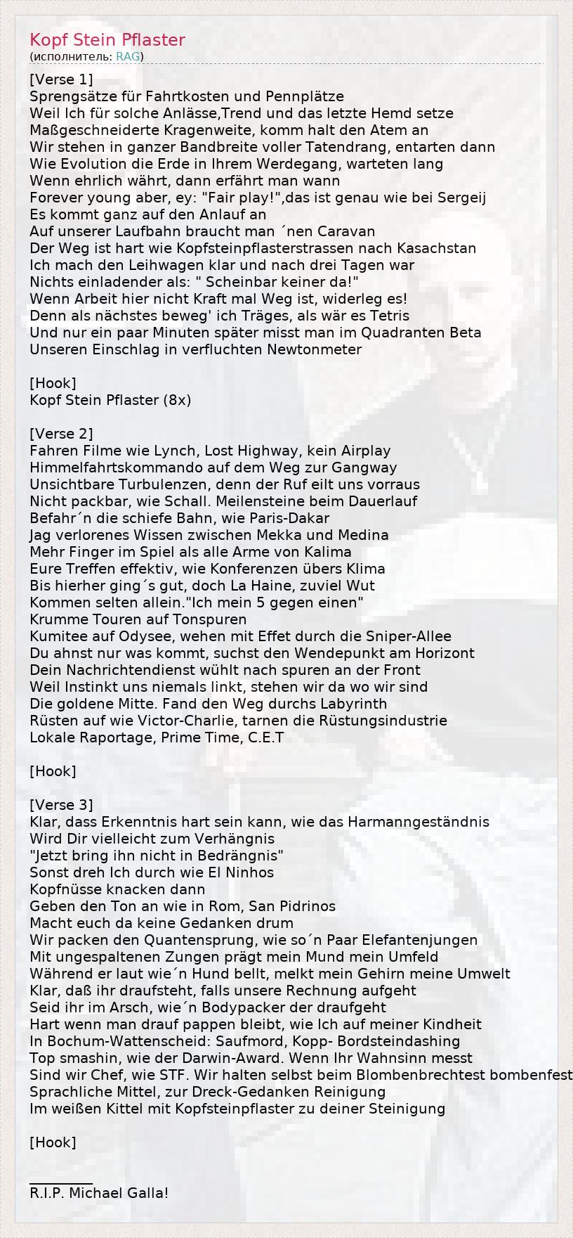 ГлавнаяИсполнителиRAGKopf Stein Pflaster