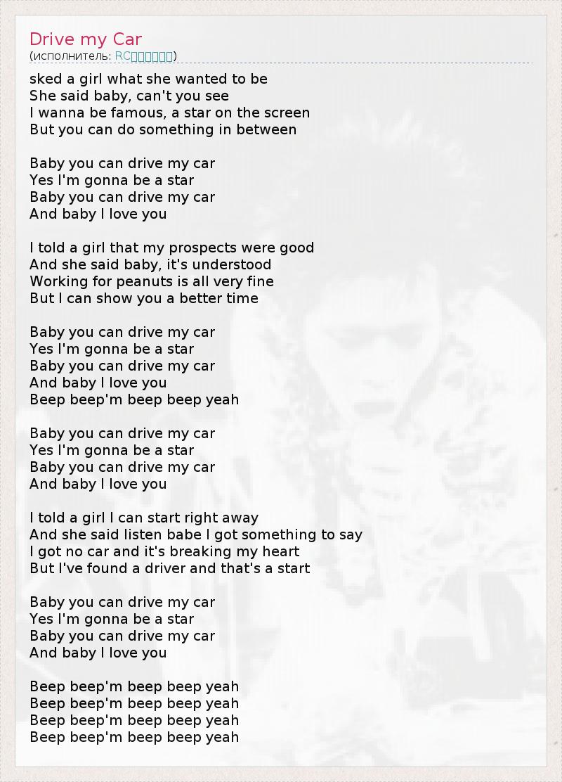 sked a girl what she wanted to be She said baby, can't you see I wanna be famous, a star on the screen But you can do something in between Baby you can drive my car Yes I'm gonna be a star Baby you can drive my car And baby I love you I told a girl that my prospects were good And she said baby, it's understood Working for peanuts is all very fine But I can show you a better time Baby you can drive my car Yes I'm gonna be a star Baby you can drive my car And baby I love you Beep beep'm beep beep yeah Baby you can drive my car Yes I'm gonna be a star Baby you can drive my car And baby I love you I told a girl I can start right away And she said listen babe I got something to say I got no car and it's breaking my heart But I've found a driver and that's a start Baby you can drive my car Yes I'm gonna be a star Baby you can drive my car And baby I love you Beep beep'm beep beep yeah Beep beep'm beep beep yeah Beep beep'm beep beep yeah Beep beep'm beep beep yeah