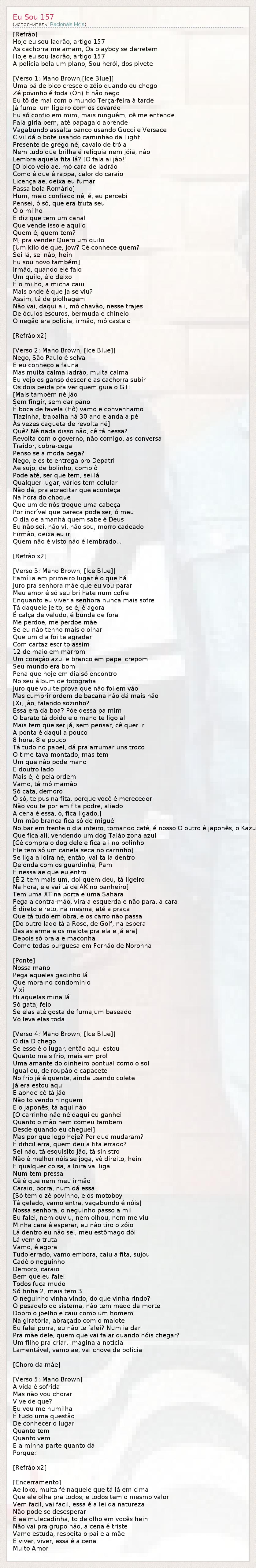 А как ты думаешь, о чем песня "Eu Sou 157" ?