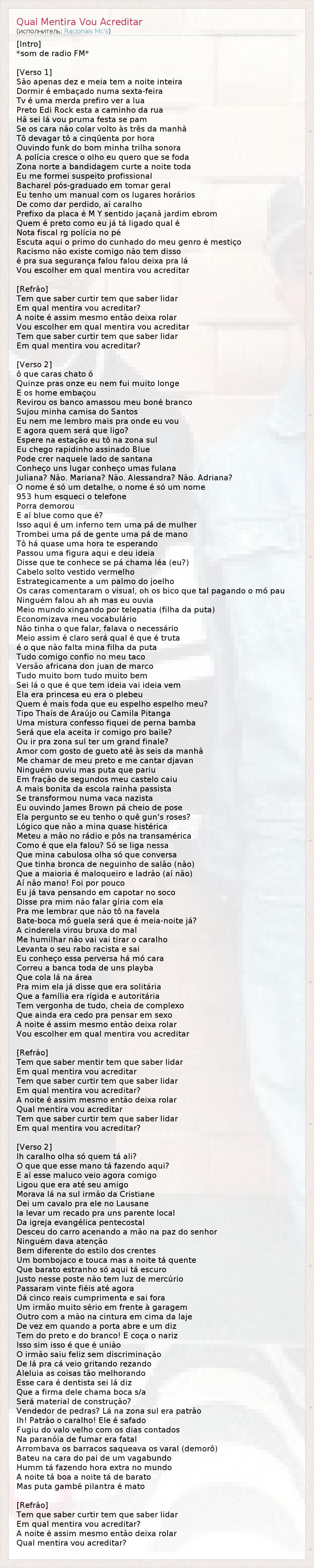 [Intro] *som de radio FM* [Verso 1] São apenas dez e meia tem a noite inteira Dormir é embaçado numa sexta-feira Tv é uma merda prefiro ver a lua Preto Edi Rock esta a caminho da rua Hã sei lá vou pruma festa se pam Se os cara não colar volto às três da manhã Tô devagar tô a cinqüenta por hora Ouvindo funk do bom minha trilha sonora A polícia cresce o olho eu quero que se foda Zona norte a bandidagem curte a noite toda Eu me formei suspeito profissional Bacharel pós-graduado em tomar geral Eu tenho um manual com os lugares horários De como dar perdido, ai caralho Prefixo da placa é M Y sentido jaçanã jardim ebrom Quem é preto como eu já tá ligado qual é Nota fiscal rg polícia no pé Escuta aqui o primo do cunhado do meu genro é mestiço Racismo não existe comigo não tem disso é pra sua segurança falou falou deixa pra lá Vou escolher em qual mentira vou acreditar [Refrão] Tem que saber curtir tem que saber lidar Em qual mentira vou acreditar? A noite é assim mesmo então deixa rolar Vou escolher em qual mentira vou acreditar Tem que saber curtir tem que saber lidar Em qual mentira vou acreditar? [Verso 2] ô que caras chato ó Quinze pras onze eu nem fui muito longe E os home embaçou Revirou os banco amassou meu boné branco Sujou minha camisa do Santos Eu nem me lembro mais pra onde eu vou E agora quem será que ligo? Espere na estação eu tô na zona sul Eu chego rapidinho assinado Blue Pode crer naquele lado de santana Conheço uns lugar conheço umas fulana Juliana? Não. Mariana? Não. Alessandra? Não. Adriana? O nome é só um detalhe, o nome é só um nome 953 hum esqueci o telefone Porra demorou E aí blue como que é? Isso aqui é um inferno tem uma pá de mulher Trombei uma pá de gente uma pá de mano Tô há quase uma hora te esperando Passou uma figura aqui e deu ideia Disse que te conhece se pá chama léa (eu?) Cabelo solto vestido vermelho Estrategicamente a um palmo do joelho Os caras comentaram o visual, oh os bico que tal pagando o mó pau Ninguém falou ah ah mas eu ouvia Meio mundo xingando por telepatia (filha da puta) Economizava meu vocabulário Não tinha o que falar, falava o necessário Meio assim é claro será qual é que é truta é o que não falta mina filha da puta Tudo comigo confio no meu taco Versão africana don juan de marco Tudo muito bom tudo muito bem Sei lá o que é que tem ideia vai ideia vem Ela era princesa eu era o plebeu Quem é mais foda que eu espelho espelho meu? Tipo Thaís de Araújo ou Camila Pitanga Uma mistura confesso fiquei de perna bamba Será que ela aceita ir comigo pro baile? Ou ir pra zona sul ter um grand finale? Amor com gosto de gueto até às seis da manhã Me chamar de meu preto e me cantar djavan Ninguém ouviu mas puta que pariu Em fração de segundos meu castelo caiu A mais bonita da escola rainha passista Se transformou numa vaca nazista Eu ouvindo James Brown pá cheio de pose Ela pergunto se eu tenho o quê gun's roses? Lógico que não a mina quase histérica Meteu a mão no rádio e pôs na transamérica Como é que ela falou? Só se liga nessa Que mina cabulosa olha só que conversa Que tinha bronca de neguinho de salão (não) Que a maioria é maloqueiro e ladrão (aí não) Aí não mano! Foi por pouco Eu já tava pensando em capotar no soco Disse pra mim não falar gíria com ela Pra me lembrar que não tô na favela Bate-boca mó guela será que é meia-noite já? A cinderela virou bruxa do mal Me humilhar não vai vai tirar o caralho Levanta o seu rabo racista e sai Eu conheço essa perversa há mó cara Correu a banca toda de uns playba Que cola lá na área Pra mim ela já disse que era solitária Que a família era rígida e autoritária Tem vergonha de tudo, cheia de complexo Que ainda era cedo pra pensar em sexo A noite é assim mesmo então deixa rolar Vou escolher em qual mentira vou acreditar [Refrão] Tem que saber mentir tem que saber lidar Em qual mentira vou acreditar Tem que saber curtir tem que saber lidar Em qual mentira vou acreditar? A noite é assim mesmo então deixa rolar Qual mentira vou acreditar Tem que saber curtir tem que saber lidar Em qual mentira vou acreditar? [Verso 2] Ih caralho olha só quem tá ali? O que que esse mano tá fazendo aqui? E aí esse maluco veio agora comigo Ligou que era até seu amigo Morava lá na sul irmão da Cristiane Dei um cavalo pra ele no Lausane Ia levar um recado pra uns parente local Da igreja evangélica pentecostal Desceu do carro acenando a mão na paz do senhor Ninguém dava atenção Bem diferente do estilo dos crentes Um bombojaco e touca mas a noite tá quente Que barato estranho só aqui tá escuro Justo nesse poste não tem luz de mercúrio Passaram vinte fiéis até agora Dá cinco reais cumprimenta e sai fora Um irmão muito sério em frente à garagem Outro com a mão na cintura em cima da laje De vez em quando a porta abre e um diz Tem do preto e do branco! E coça o nariz Isso sim isso é que é união O irmão saiu feliz sem discriminação De lá pra cá veio gritando rezando Aleluia as coisas tão melhorando Esse cara é dentista sei lá diz Que a firma dele chama boca s/a Será material de construção? Vendedor de pedras? Lá na zona sul era patrão Ih! Patrão o caralho! Ele é safado Fugiu do valo velho com os dias contados Na paranóia de fumar era fatal Arrombava os barracos saqueava os varal (demorô) Bateu na cara do pai de um vagabundo Humm tá fazendo hora extra no mundo A noite tá boa a noite tá de barato Mas puta gambé pilantra é mato [Refrão] Tem que saber curtir tem que saber lidar Em qual mentira vou acreditar? A noite é assim mesmo então deixa rolar Qual mentira vou acreditar?