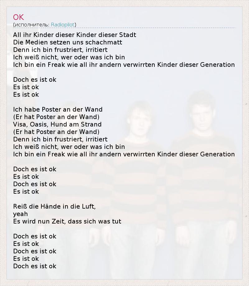 Это интересно:Radiopilot - немецкая группа из Берлина. Сами они представляются как поп-группа, музыка которой обогащена некоторыми элементами рока.Предшественником группы считается коллектив Greensession, в состав которого входили как нынешние участники Radiopilot, так и другие исполнители,состав которых постоянно менялся вплоть до прихода в группу Лукаса Пицона, являющегося солистом Radiopilot по сей день. Greensession... продолжение