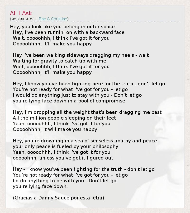 Hey, you look like you belong in outer space Hey, I've been runnin' on with a backward face Wait, ooooohhh, I think I've got it for you Ooooohhhh, it'll make you happy Hey I've been walking sideways dragging my heels - wait Waiting for gravity to catch up with me Wait, ooooohhh, I think I've got it for you Ooooohhhh, it'll make you happy Hey, I know you've been fighting here for the truth - don't let go You're not ready for what I've got for you - let go I would do anything just to stay with you - Don't let go you're lying face down in a pool of compromise Hey, I'm dropping all the weight that's been dragging me past All the million people sleeping on their feet Yeah, ooooohhh, I think I've got it for you Ooooohhhh, it will make you happy Hey, you're drowning in a sea of senseless apathy and peace your only peace is fueled by your philosophy Yeah, ooooohhh, I think I've got it for you ooooohhh, unless you've got it figured out Hey - I know you've been fighting for the truth - don't let go You're not ready for what I've got for you - let go I'd do anything to be with you - Don't let go you're lying face down. (Gracias a Danny Sauce por esta letra)