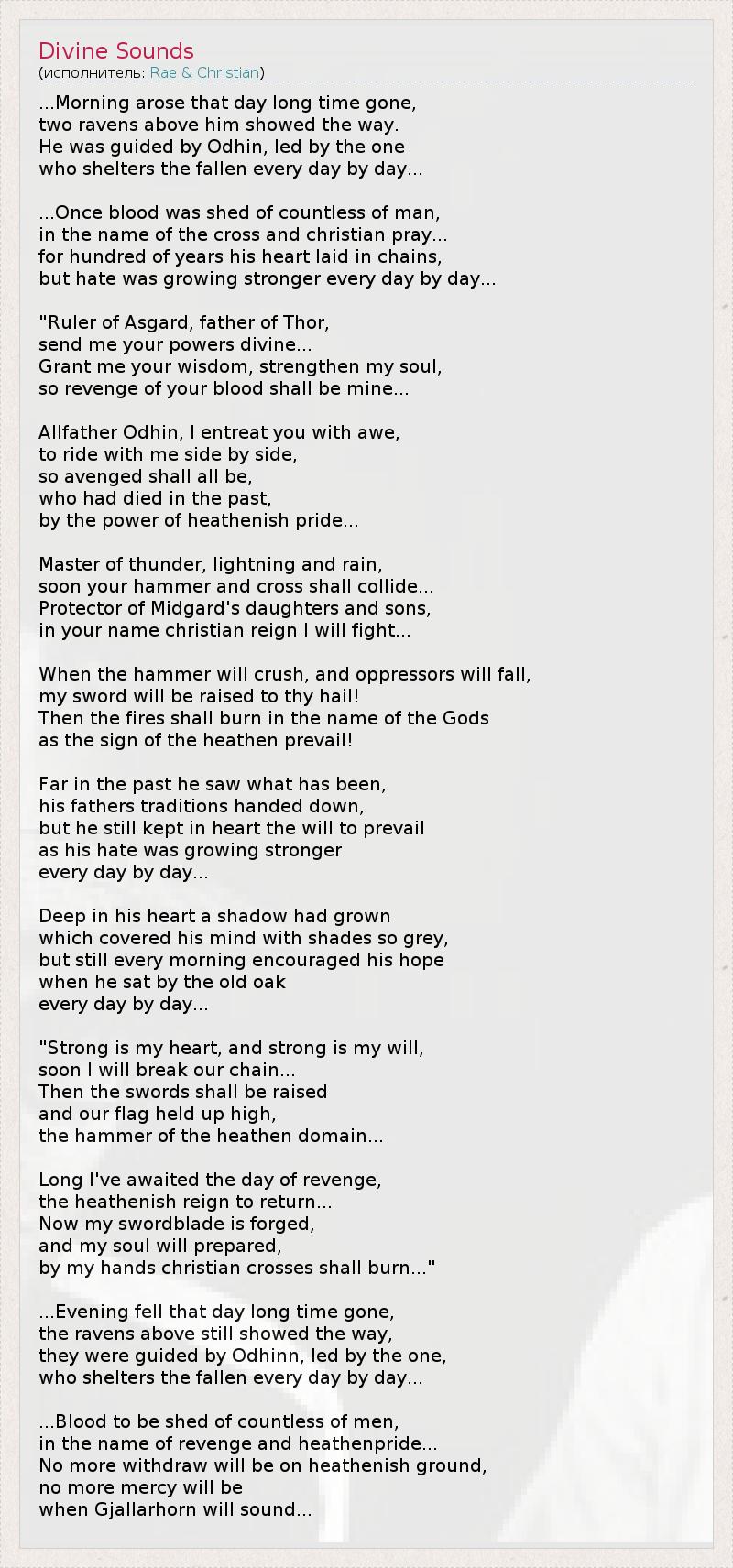 ...Наступило утро давно минувших дней, Два ворона над ним указывали путь. Ведомый самим Одином, 1 он следовал к тому, Кто даёт приют павшим день за днём... ...Однажды кровь несметного количества людей Была пролита во имя креста и христианских молитв. Тысячи лет покоилось в цепях его сердце, Становилась сильнее ненависть день ото дня... "Владыка Асгарда, 2 отец Тора, Даруй мне божественную мощь, Даруй мне свою мудрость, укрепи душу, Пусть твоя кровная месть станет моею... Отец всевышний Один, благоговейно тебя молю, Веди меня рядом с собою, Вместе отомстим за тех, Кто в прошлом погиб За могущество языческой гордости. Владыка грома, молний и ливней, Вскоре сойдутся твой молот и крест, Защитник дочерей и сыновей Мидгарда, 3 Во имя тебя я буду сражаться с христианским царствованием... Когда молот твой сокрушит угнетателей, Во славу твою будет поднят мой меч! И возгорится пламя во имя Богов, Восторжествует языческое знамя!" В далёком прошлом видел он, Как традиции его отцов были растоптаны, Но его сердце продолжало надеяться на триумф, И ненависть его росла День ото дня... В глубине души его тени взрастали, Что окутали мраком сознание, Но каждое утро его вдохновляла надежда, Когда он сидел под тенями старого дуба, День за днём... "Сильно моё сердце и стальная моя воля, Вскоре я сломлю наши цепи... Поднимутся наши мечи, Взвеются знамёна, Поднимется молот над языческими землями... Так долго ждал я этого дня, Чтобы возвратить язычества господство, Теперь готов мой клинок, Готова душа, Сожгу я своими руками христианские кресты..." ...Сменил вечер день давно минувший, Вороны как прежде указывают путь, Ведомый самим Одином, он следовал к тому, Кто даёт приют павшим день за днём... ...Пролита кровь несметного количества людей Во имя мести и языческой гордыни. Ничто более не вернётся на языческие земли, И никому не будет пощады, Когда протрубит Гьяллархорн... 4 1 – верховное божество скандинавского пантеона. 2 – обиталище богов-асов. 3 – обиталище людей, "срединный град". 4 – золотой рог, звучание которого возвестит всему миру о Рагнарёке.