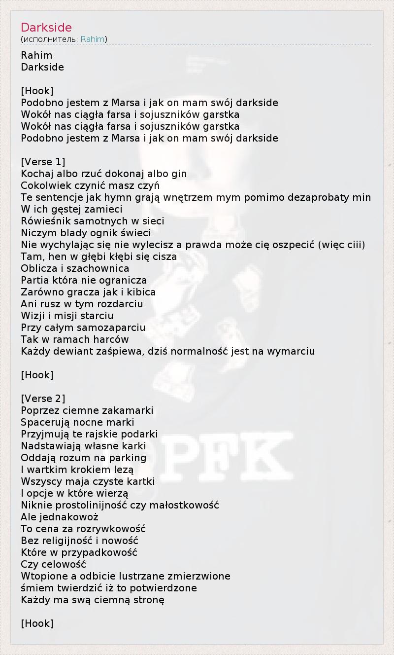 Rahim Darkside [Hook] Podobno jestem z Marsa i jak on mam swój darkside Wokół nas ciągła farsa i sojuszników garstka Wokół nas ciągła farsa i sojuszników garstka Podobno jestem z Marsa i jak on mam swój darkside [Verse 1] Kochaj albo rzuć dokonaj albo gin Cokolwiek czynić masz czyń Te sentencje jak hymn grają wnętrzem mym pomimo dezaprobaty min W ich gęstej zamieci Rówieśnik samotnych w sieci Niczym blady ognik świeci Nie wychylając się nie wylecisz a prawda może cię oszpecić (więc ciii) Tam, hen w głębi kłębi się cisza Oblicza i szachownica Partia która nie ogranicza Zarówno gracza jak i kibica Ani rusz w tym rozdarciu Wizji i misji starciu Przy całym samozaparciu Tak w ramach harców Każdy dewiant zaśpiewa, dziś normalność jest na wymarciu [Hook] [Verse 2] Poprzez ciemne zakamarki Spacerują nocne marki Przyjmują te rajskie podarki Nadstawiają własne karki Oddają rozum na parking I wartkim krokiem lezą Wszyscy maja czyste kartki I opcje w które wierzą Niknie prostolinijność czy małostkowość Ale jednakowoż To cena za rozrywkowość Bez religijność i nowość Które w przypadkowość Czy celowość Wtopione a odbicie lustrzane zmierzwione śmiem twierdzić iż to potwierdzone Każdy ma swą ciemną stronę [Hook]