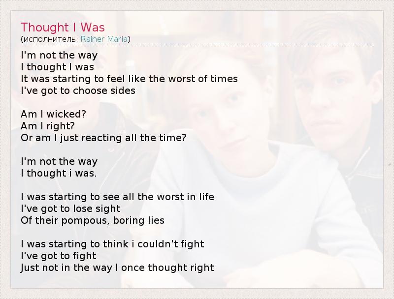 I'm not the way I thought I was It was starting to feel like the worst of times I've got to choose sides Am I wicked? Am I right? Or am I just reacting all the time? I'm not the way I thought i was. I was starting to see all the worst in life I've got to lose sight Of their pompous, boring lies I was starting to think i couldn't fight I've got to fight Just not in the way I once thought right