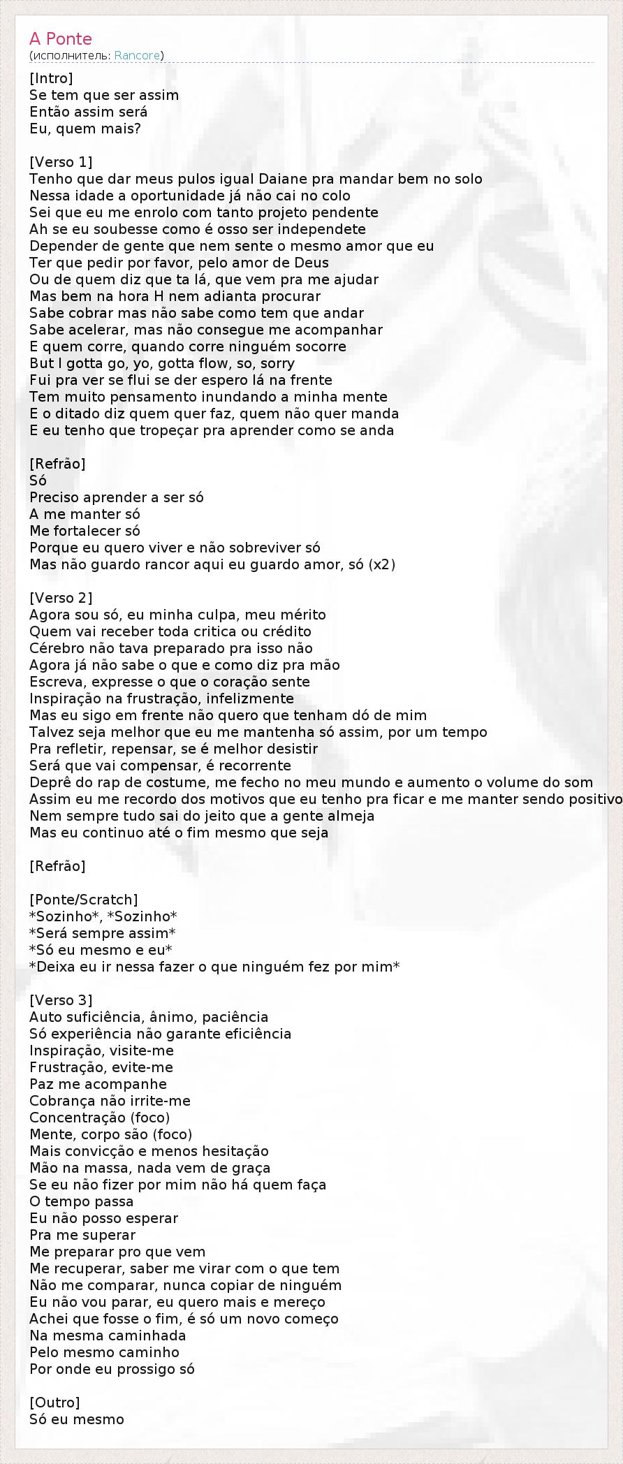 [Intro] Se tem que ser assim Então assim será Eu, quem mais? [Verso 1] Tenho que dar meus pulos igual Daiane pra mandar bem no solo Nessa idade a oportunidade já não cai no colo Sei que eu me enrolo com tanto projeto pendente Ah se eu soubesse como é osso ser independete Depender de gente que nem sente o mesmo amor que eu Ter que pedir por favor, pelo amor de Deus Ou de quem diz que ta lá, que vem pra me ajudar Mas bem na hora H nem adianta procurar Sabe cobrar mas não sabe como tem que andar Sabe acelerar, mas não consegue me acompanhar E quem corre, quando corre ninguém socorre But I gotta go, yo, gotta flow, so, sorry Fui pra ver se flui se der espero lá na frente Tem muito pensamento inundando a minha mente E o ditado diz quem quer faz, quem não quer manda E eu tenho que tropeçar pra aprender como se anda [Refrão] Só Preciso aprender a ser só A me manter só Me fortalecer só Porque eu quero viver e não sobreviver só Mas não guardo rancor aqui eu guardo amor, só (x2) [Verso 2] Agora sou só, eu minha culpa, meu mérito Quem vai receber toda critica ou crédito Cérebro não tava preparado pra isso não Agora já não sabe o que e como diz pra mão Escreva, expresse o que o coração sente Inspiração na frustração, infelizmente Mas eu sigo em frente não quero que tenham dó de mim Talvez seja melhor que eu me mantenha só assim, por um tempo Pra refletir, repensar, se é melhor desistir Será que vai compensar, é recorrente Deprê do rap de costume, me fecho no meu mundo e aumento o volume do som Assim eu me recordo dos motivos que eu tenho pra ficar e me manter sendo positivo Nem sempre tudo sai do jeito que a gente almeja Mas eu continuo até o fim mesmo que seja [Refrão] [Ponte/Scratch] *Sozinho*, *Sozinho* *Será sempre assim* *Só eu mesmo e eu* *Deixa eu ir nessa fazer o que ninguém fez por mim* [Verso 3] Auto suficiência, ânimo, paciência Só experiência não garante eficiência Inspiração, visite-me Frustração, evite-me Paz me acompanhe Cobrança não irrite-me Concentração (foco) Mente, corpo são (foco) Mais convicção e menos hesitação Mão na massa, nada vem de graça Se eu não fizer por mim não há quem faça O tempo passa Eu não posso esperar Pra me superar Me preparar pro que vem Me recuperar, saber me virar com o que tem Não me comparar, nunca copiar de ninguém Eu não vou parar, eu quero mais e mereço Achei que fosse o fim, é só um novo começo Na mesma caminhada Pelo mesmo caminho Por onde eu prossigo só [Outro] Só eu mesmo