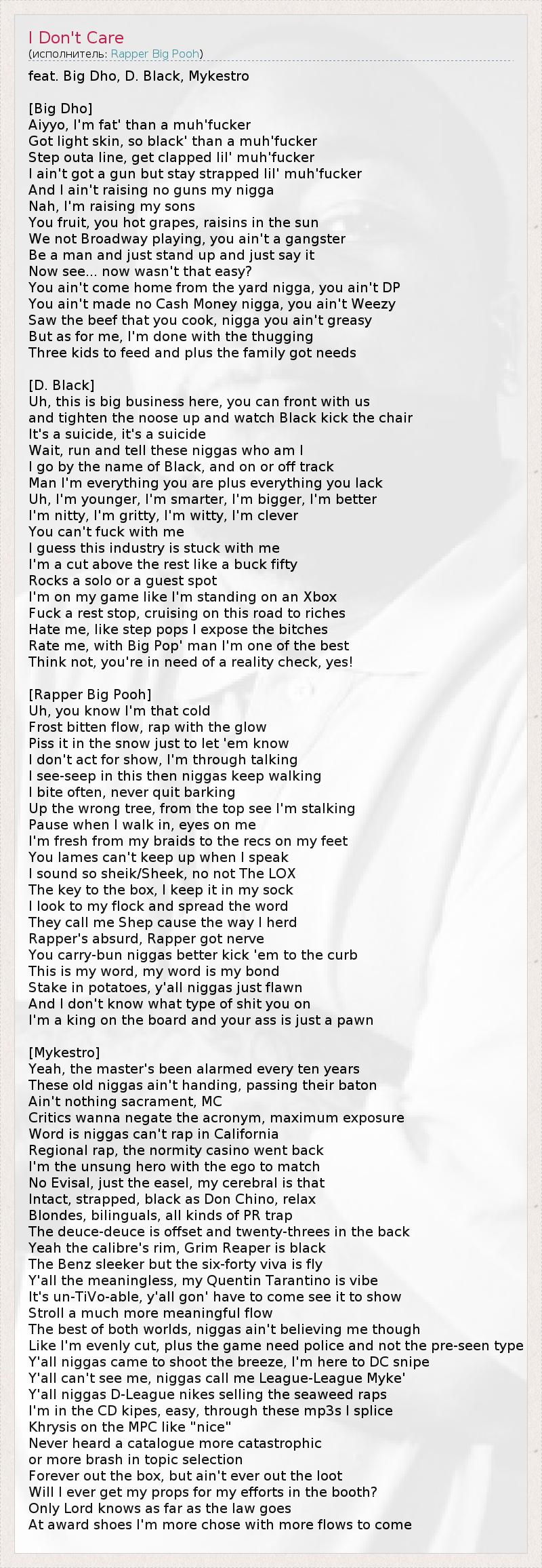 feat. Big Dho, D. Black, Mykestro [Big Dho] Aiyyo, I'm fat' than a muh'fucker Got light skin, so black' than a muh'fucker Step outa line, get clapped lil' muh'fucker I ain't got a gun but stay strapped lil' muh'fucker And I ain't raising no guns my nigga Nah, I'm raising my sons You fruit, you hot grapes, raisins in the sun We not Broadway playing, you ain't a gangster Be a man and just stand up and just say it Now see... now wasn't that easy? You ain't come home from the yard nigga, you ain't DP You ain't made no Cash Money nigga, you ain't Weezy Saw the beef that you cook, nigga you ain't greasy But as for me, I'm done with the thugging Three kids to feed and plus the family got needs [D. Black] Uh, this is big business here, you can front with us and tighten the noose up and watch Black kick the chair It's a suicide, it's a suicide Wait, run and tell these niggas who am I I go by the name of Black, and on or off track Man I'm everything you are plus everything you lack Uh, I'm younger, I'm smarter, I'm bigger, I'm better I'm nitty, I'm gritty, I'm witty, I'm clever You can't fuck with me I guess this industry is stuck with me I'm a cut above the rest like a buck fifty Rocks a solo or a guest spot I'm on my game like I'm standing on an Xbox Fuck a rest stop, cruising on this road to riches Hate me, like step pops I expose the bitches Rate me, with Big Pop' man I'm one of the best Think not, you're in need of a reality check, yes! [Rapper Big Pooh] Uh, you know I'm that cold Frost bitten flow, rap with the glow Piss it in the snow just to let 'em know I don't act for show, I'm through talking I see-seep in this then niggas keep walking I bite often, never quit barking Up the wrong tree, from the top see I'm stalking Pause when I walk in, eyes on me I'm fresh from my braids to the recs on my feet You lames can't keep up when I speak I sound so sheik/Sheek, no not The LOX The key to the box, I keep it in my sock I look to my flock and spread the word They call me Shep cause the way I herd Rapper's absurd, Rapper got nerve You carry-bun niggas better kick 'em to the curb This is my word, my word is my bond Stake in potatoes, y'all niggas just flawn And I don't know what type of shit you on I'm a king on the board and your ass is just a pawn [Mykestro] Yeah, the master's been alarmed every ten years These old niggas ain't handing, passing their baton Ain't nothing sacrament, MC Critics wanna negate the acronym, maximum exposure Word is niggas can't rap in California Regional rap, the normity casino went back I'm the unsung hero with the ego to match No Evisal, just the easel, my cerebral is that Intact, strapped, black as Don Chino, relax Blondes, bilinguals, all kinds of PR trap The deuce-deuce is offset and twenty-threes in the back Yeah the calibre's rim, Grim Reaper is black The Benz sleeker but the six-forty viva is fly Y'all the meaningless, my Quentin Tarantino is vibe It's un-TiVo-able, y'all gon' have to come see it to show Stroll a much more meaningful flow The best of both worlds, niggas ain't believing me though Like I'm evenly cut, plus the game need police and not the pre-seen type Y'all niggas came to shoot the breeze, I'm here to DC snipe Y'all can't see me, niggas call me League-League Myke' Y'all niggas D-League nikes selling the seaweed raps I'm in the CD kipes, easy, through these mp3s I splice Khrysis on the MPC like "nice" Never heard a catalogue more catastrophic or more brash in topic selection Forever out the box, but ain't ever out the loot Will I ever get my props for my efforts in the booth? Only Lord knows as far as the law goes At award shoes I'm more chose with more flows to come