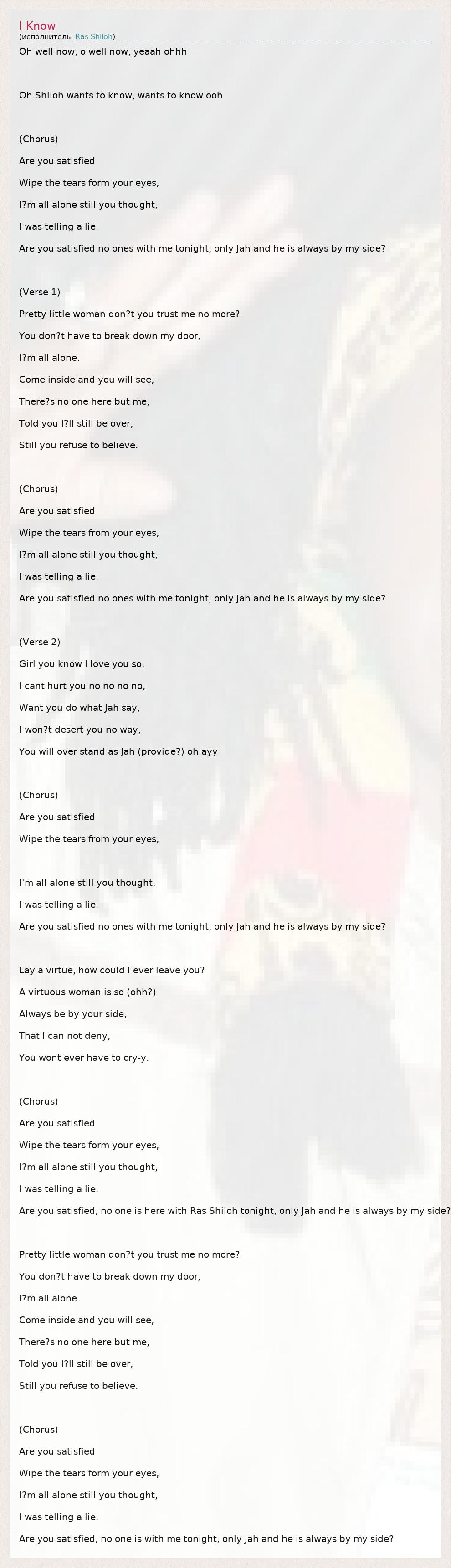 Oh well now, o well now, yeaah ohhh Oh Shiloh wants to know, wants to know ooh (Chorus) Are you satisfied Wipe the tears form your eyes, I?m all alone still you thought, I was telling a lie. Are you satisfied no ones with me tonight, only Jah and he is always by my side? (Verse 1) Pretty little woman don?t you trust me no more? You don?t have to break down my door, I?m all alone. Come inside and you will see, There?s no one here but me, Told you I?ll still be over, Still you refuse to believe. (Chorus) Are you satisfied Wipe the tears from your eyes, I?m all alone still you thought, I was telling a lie. Are you satisfied no ones with me tonight, only Jah and he is always by my side? (Verse 2) Girl you know I love you so, I cant hurt you no no no no, Want you do what Jah say, I won?t desert you no way, You will over stand as Jah (provide?) oh ayy (Chorus) Are you satisfied Wipe the tears from your eyes, I'm all alone still you thought, I was telling a lie. Are you satisfied no ones with me tonight, only Jah and he is always by my side? Lay a virtue, how could I ever leave you? A virtuous woman is so (ohh?) Always be by your side, That I can not deny, You wont ever have to cry-y. (Chorus) Are you satisfied Wipe the tears form your eyes, I?m all alone still you thought, I was telling a lie. Are you satisfied, no one is here with Ras Shiloh tonight, only Jah and he is always by my side? Pretty little woman don?t you trust me no more? You don?t have to break down my door, I?m all alone. Come inside and you will see, There?s no one here but me, Told you I?ll still be over, Still you refuse to believe. (Chorus) Are you satisfied Wipe the tears form your eyes, I?m all alone still you thought, I was telling a lie. Are you satisfied, no one is with me tonight, only Jah and he is always by my side?