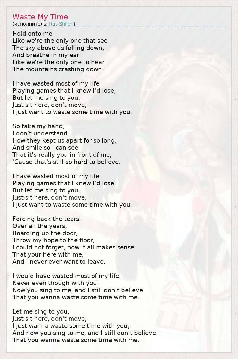 Держись за меня, Будто мы единственные видим, что Небо падает, И дыши мне в ухо, Будто мы единственные слышим, что Горы рушатся. Я потратил впустую бо?льшую часть совей жизни, Играл в заведомо проигрышные игры, Но позволь мне спеть тебе, Просто сядь здесь и не шевелись, Я просто хочу впустую потратить с тобой немного времени. Возьми меня за руку, Не понимаю, Как они не давали нам встретиться так долго, Улыбнись, чтобы я понял, Что передо мной и в самом деле ты, Потому что в это по-прежнему сложно поверить. Я потратил впустую бо?льшую часть совей жизни, Играл в заведомо проигрышные игры, Но позволь мне спеть тебе, Просто сядь здесь и не шевелись, Я просто хочу впустую потратить с тобой немного времени. Заставляю возвращаться слёзы За все эти годы, Заколачиваю дверь, Швыряю свою надежду на пол, Я бы не смог забыть, теперь всё ясно и разумно, Когда ты здесь со мной, Я никогда не захочу уйти. Я бы потратил впустую бо?льшую часть совей жизни, Но не с тобой. А теперь ты поёшь мне, и мне всё ещё не верится, Что ты хочешь впустую потратить со мной немного времени. Но позволь мне спеть тебе, Просто сядь здесь и не шевелись, Я просто хочу впустую потратить с тобой немного времени, А теперь ты поёшь мне, и мне всё ещё не верится, Что ты хочешь впустую потратить со мной немного времени.