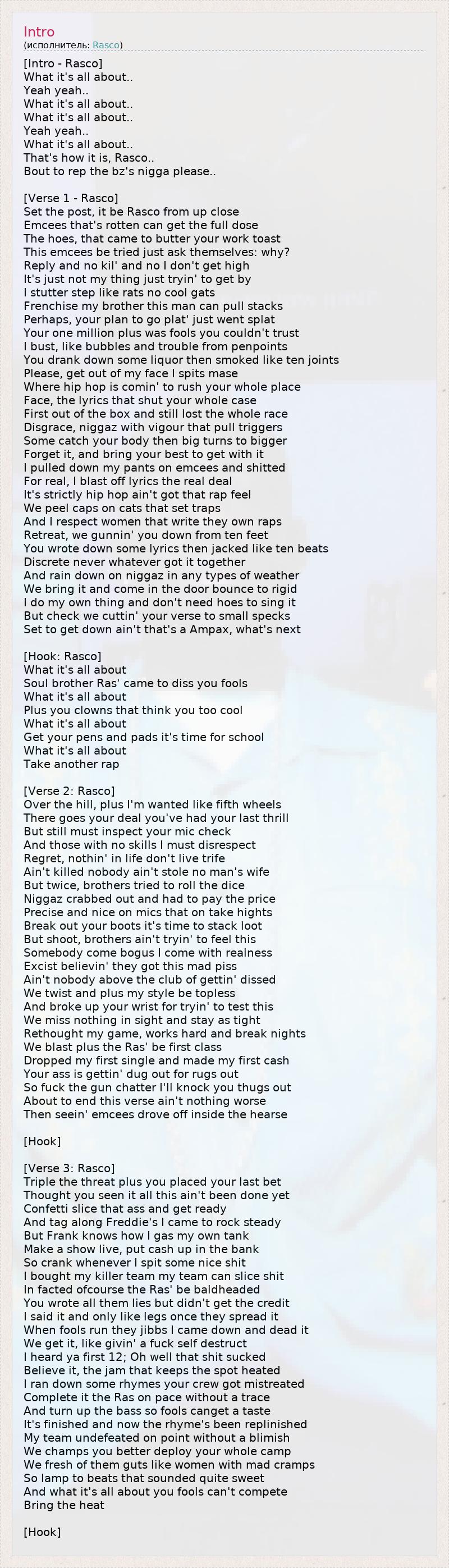 Это интересно:Keida Brewer родился 10-го сентября 1970 года в San Mateo (пригород San Francisco), California, USA.Rasco (аббревиатура расшифровывается как «Realistic, Ambitious, Serious, Cautious & Organized») - рэппер из San Francisco, чьи ранние записи были выпущены на лейбле «Stones Throw Records». Также, он является участником группы Cali Agents совместно с рэппером Planet Asia, и состоял в группе Various Blends, в начале своей карьеры. Его глубокий голос и прямолинейный стиль... продолжение