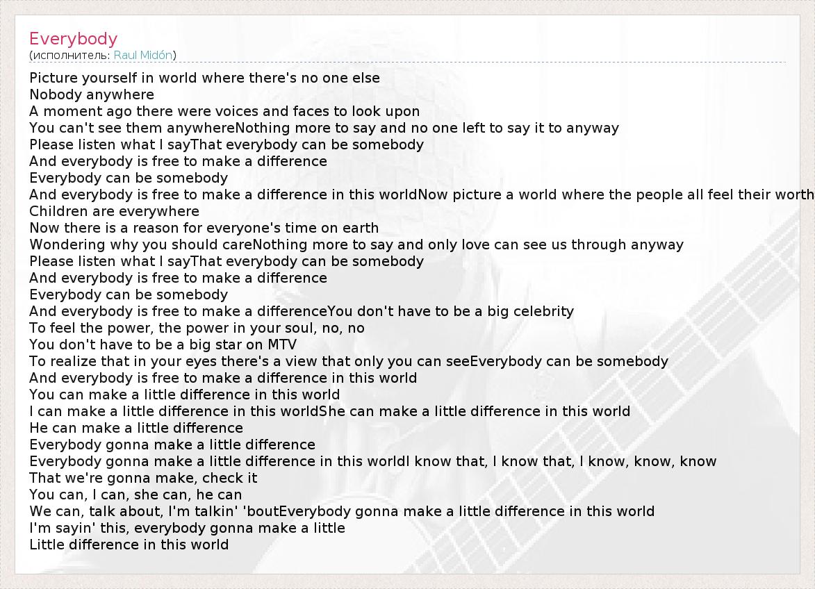 Picture yourself in world where there's no one else Nobody anywhere A moment ago there were voices and faces to look upon You can't see them anywhereNothing more to say and no one left to say it to anyway Please listen what I sayThat everybody can be somebody And everybody is free to make a difference Everybody can be somebody And everybody is free to make a difference in this worldNow picture a world where the people all feel their worth Children are everywhere Now there is a reason for everyone's time on earth Wondering why you should careNothing more to say and only love can see us through anyway Please listen what I sayThat everybody can be somebody And everybody is free to make a difference Everybody can be somebody And everybody is free to make a differenceYou don't have to be a big celebrity To feel the power, the power in your soul, no, no You don't have to be a big star on MTV To realize that in your eyes there's a view that only you can seeEverybody can be somebody And everybody is free to make a difference in this world You can make a little difference in this world I can make a little difference in this worldShe can make a little difference in this world He can make a little difference Everybody gonna make a little difference Everybody gonna make a little difference in this worldI know that, I know that, I know, know, know That we're gonna make, check it You can, I can, she can, he can We can, talk about, I'm talkin' 'boutEverybody gonna make a little difference in this world I'm sayin' this, everybody gonna make a little Little difference in this world