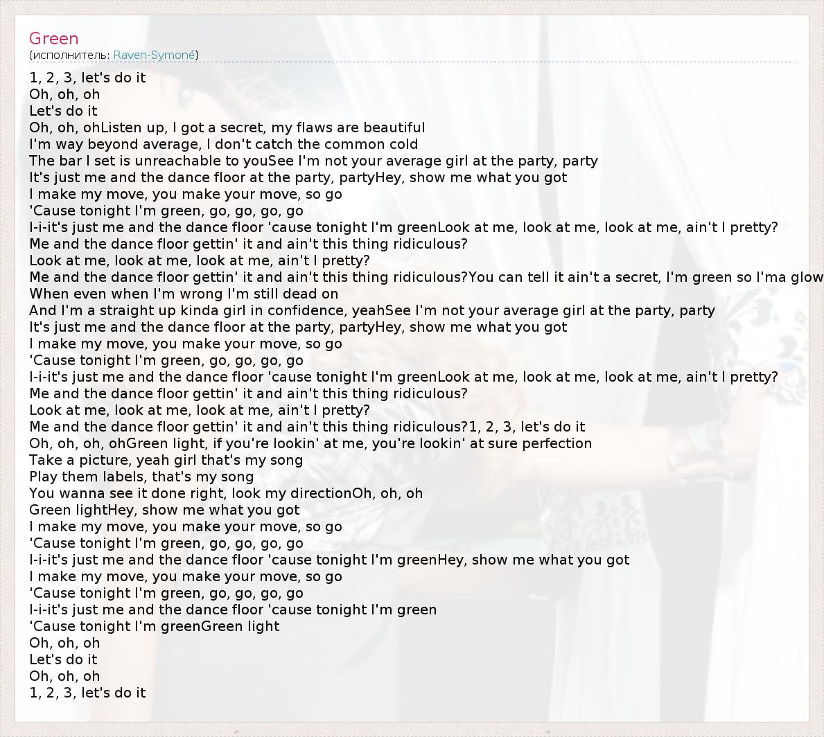 1, 2, 3, let's do it Oh, oh, oh Let's do it Oh, oh, ohListen up, I got a secret, my flaws are beautiful I'm way beyond average, I don't catch the common cold The bar I set is unreachable to youSee I'm not your average girl at the party, party It's just me and the dance floor at the party, partyHey, show me what you got I make my move, you make your move, so go 'Cause tonight I'm green, go, go, go, go I-i-it's just me and the dance floor 'cause tonight I'm greenLook at me, look at me, look at me, ain't I pretty? Me and the dance floor gettin' it and ain't this thing ridiculous? Look at me, look at me, look at me, ain't I pretty? Me and the dance floor gettin' it and ain't this thing ridiculous?You can tell it ain't a secret, I'm green so I'ma glow When even when I'm wrong I'm still dead on And I'm a straight up kinda girl in confidence, yeahSee I'm not your average girl at the party, party It's just me and the dance floor at the party, partyHey, show me what you got I make my move, you make your move, so go 'Cause tonight I'm green, go, go, go, go I-i-it's just me and the dance floor 'cause tonight I'm greenLook at me, look at me, look at me, ain't I pretty? Me and the dance floor gettin' it and ain't this thing ridiculous? Look at me, look at me, look at me, ain't I pretty? Me and the dance floor gettin' it and ain't this thing ridiculous?1, 2, 3, let's do it Oh, oh, oh, ohGreen light, if you're lookin' at me, you're lookin' at sure perfection Take a picture, yeah girl that's my song Play them labels, that's my song You wanna see it done right, look my directionOh, oh, oh Green lightHey, show me what you got I make my move, you make your move, so go 'Cause tonight I'm green, go, go, go, go I-i-it's just me and the dance floor 'cause tonight I'm greenHey, show me what you got I make my move, you make your move, so go 'Cause tonight I'm green, go, go, go, go I-i-it's just me and the dance floor 'cause tonight I'm green 'Cause tonight I'm greenGreen light Oh, oh, oh Let's do it Oh, oh, oh 1, 2, 3, let's do it
