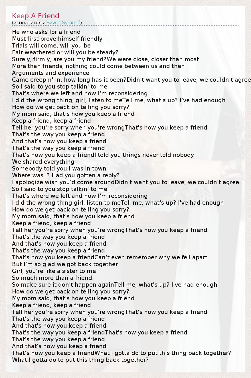 He who asks for a friend Must first prove himself friendly Trials will come, will you be Fair weathered or will you be steady? Surely, firmly, are you my friend?We were close, closer than most More than friends, nothing could come between us and then Arguments and experience Came creepin' in, how long has it been?Didn't want you to leave, we couldn't agree So I said to you stop talkin' to me That's where we left and now I'm reconsidering I did the wrong thing, girl, listen to meTell me, what's up? I've had enough How do we get back on telling you sorry? My mom said, that's how you keep a friend Keep a friend, keep a friend Tell her you're sorry when you're wrongThat's how you keep a friend That's the way you keep a friend And that's how you keep a friend That's the way you keep a friend That's how you keep a friendI told you things never told nobody We shared everything Somebody told you I was in town Where was I? Had you gotten a reply? I apologize wish you'd come aroundDidn't want you to leave, we couldn't agree So I said to you stop talkin' to me That's where we left and now I'm reconsidering I did the wrong thing girl, listen to meTell me, what's up? I've had enough How do we get back on telling you sorry? My mom said, that's how you keep a friend Keep a friend, keep a friend Tell her you're sorry when you're wrongThat's how you keep a friend That's the way you keep a friend And that's how you keep a friend That's the way you keep a friend That's how you keep a friendCan't even remember why we fell apart But I'm so glad we got back together Girl, you're like a sister to me So much more than a friend So make sure it don't happen againTell me, what's up? I've had enough How do we get back on telling you sorry? My mom said, that's how you keep a friend Keep a friend, keep a friend Tell her you're sorry when you're wrongThat's how you keep a friend That's the way you keep a friend And that's how you keep a friend That's the way you keep a friendThat's how you keep a friend That's the way you keep a friend And that's how you keep a friend That's how you keep a friendWhat I gotta do to put this thing back together? What I gotta do to put this thing back together?