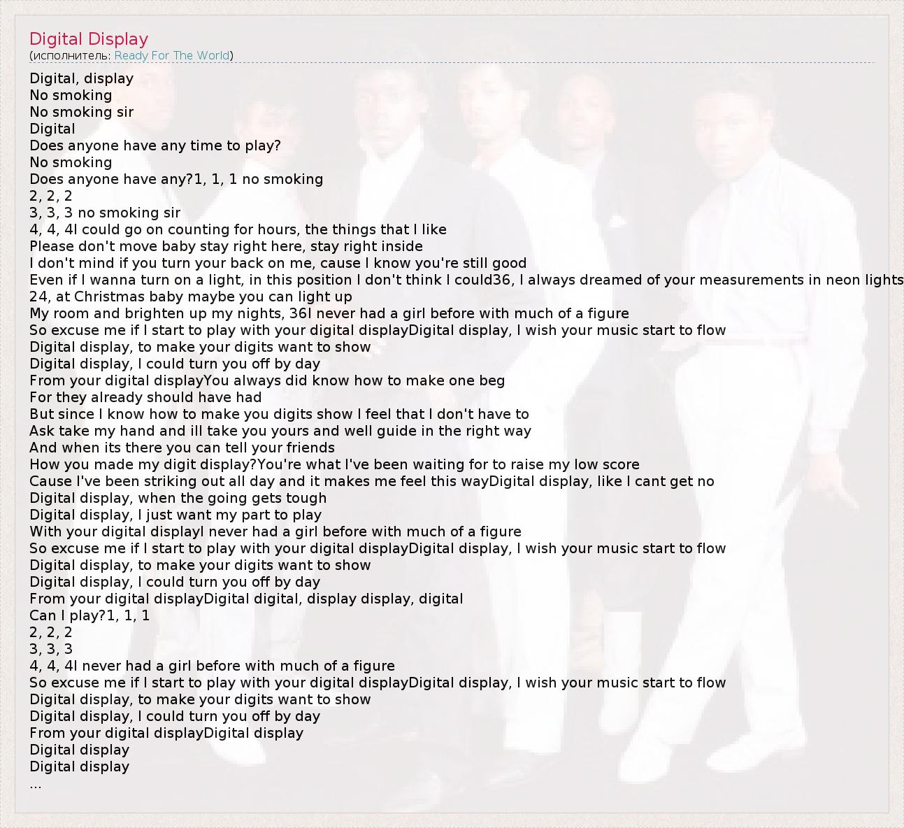Digital, display No smoking No smoking sir Digital Does anyone have any time to play? No smoking Does anyone have any?1, 1, 1 no smoking 2, 2, 2 3, 3, 3 no smoking sir 4, 4, 4I could go on counting for hours, the things that I like Please don't move baby stay right here, stay right inside I don't mind if you turn your back on me, cause I know you're still good Even if I wanna turn on a light, in this position I don't think I could36, I always dreamed of your measurements in neon lights 24, at Christmas baby maybe you can light up My room and brighten up my nights, 36I never had a girl before with much of a figure So excuse me if I start to play with your digital displayDigital display, I wish your music start to flow Digital display, to make your digits want to show Digital display, I could turn you off by day From your digital displayYou always did know how to make one beg For they already should have had But since I know how to make you digits show I feel that I don't have to Ask take my hand and ill take you yours and well guide in the right way And when its there you can tell your friends How you made my digit display?You're what I've been waiting for to raise my low score Cause I've been striking out all day and it makes me feel this wayDigital display, like I cant get no Digital display, when the going gets tough Digital display, I just want my part to play With your digital displayI never had a girl before with much of a figure So excuse me if I start to play with your digital displayDigital display, I wish your music start to flow Digital display, to make your digits want to show Digital display, I could turn you off by day From your digital displayDigital digital, display display, digital Can I play?1, 1, 1 2, 2, 2 3, 3, 3 4, 4, 4I never had a girl before with much of a figure So excuse me if I start to play with your digital displayDigital display, I wish your music start to flow Digital display, to make your digits want to show Digital display, I could turn you off by day From your digital displayDigital display Digital display Digital display ...