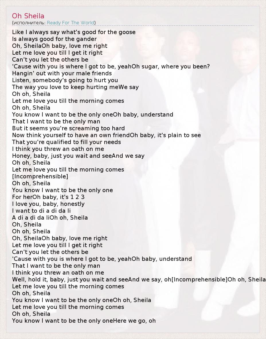 Like I always say what's good for the goose Is always good for the gander Oh, SheilaOh baby, love me right Let me love you till I get it right Can't you let the others be 'Cause with you is where I got to be, yeahOh sugar, where you been? Hangin' out with your male friends Listen, somebody's going to hurt you The way you love to keep hurting meWe say Oh oh, Sheila Let me love you till the morning comes Oh oh, Sheila You know I want to be the only oneOh baby, understand That I want to be the only man But it seems you're screaming too hard Now think yourself to have an own friendOh baby, it's plain to see That you're qualified to fill your needs I think you threw an oath on me Honey, baby, just you wait and seeAnd we say Oh oh, Sheila Let me love you till the morning comes [Incomprehensible] Oh oh, Sheila You know I want to be the only one For herOh baby, it's 1 2 3 I love you, baby, honestly I want to di a di da li A di a di da liOh oh, Sheila Oh, Sheila Oh oh, Sheila Oh, SheilaOh baby, love me right Let me love you till I get it right Can't you let the others be 'Cause with you is where I got to be, yeahOh baby, understand That I want to be the only man I think you threw an oath on me Well, hold it, baby, just you wait and seeAnd we say, oh[Incomprehensible]Oh oh, Sheila Let me love you till the morning comes Oh oh, Sheila You know I want to be the only oneOh oh, Sheila Let me love you till the morning comes Oh oh, Sheila You know I want to be the only oneHere we go, oh