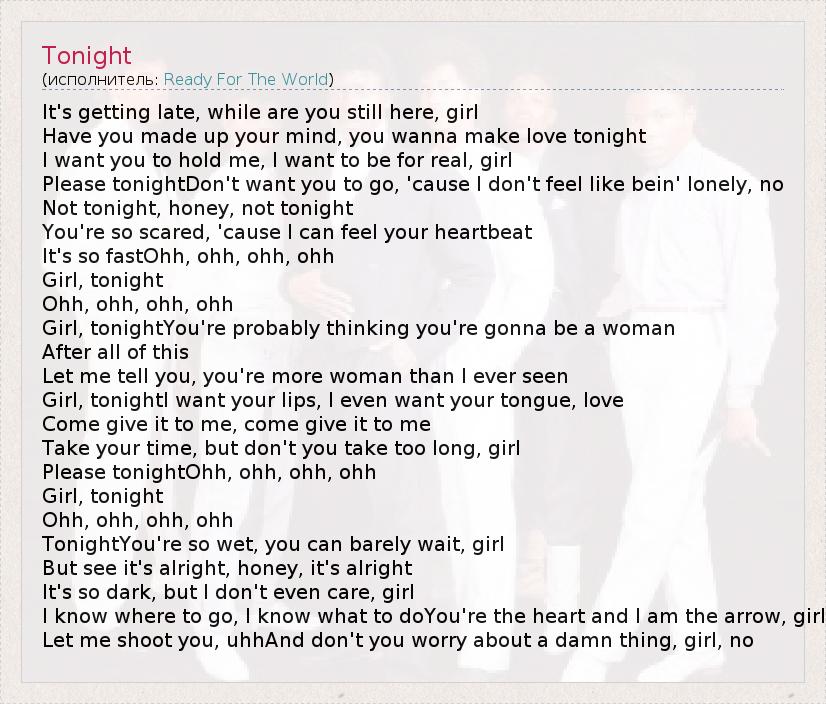 It's getting late, while are you still here, girl Have you made up your mind, you wanna make love tonight I want you to hold me, I want to be for real, girl Please tonightDon't want you to go, 'cause I don't feel like bein' lonely, no Not tonight, honey, not tonight You're so scared, 'cause I can feel your heartbeat It's so fastOhh, ohh, ohh, ohh Girl, tonight Ohh, ohh, ohh, ohh Girl, tonightYou're probably thinking you're gonna be a woman After all of this Let me tell you, you're more woman than I ever seen Girl, tonightI want your lips, I even want your tongue, love Come give it to me, come give it to me Take your time, but don't you take too long, girl Please tonightOhh, ohh, ohh, ohh Girl, tonight Ohh, ohh, ohh, ohh TonightYou're so wet, you can barely wait, girl But see it's alright, honey, it's alright It's so dark, but I don't even care, girl I know where to go, I know what to doYou're the heart and I am the arrow, girl Let me shoot you, uhhAnd don't you worry about a damn thing, girl, no