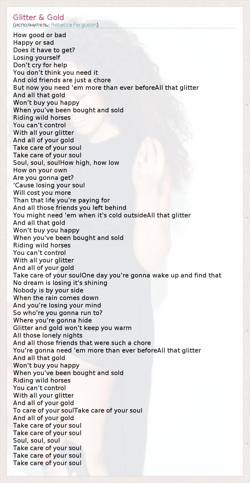 How good or bad Happy or sad Does it have to get? Losing yourself Don't cry for help You don't think you need it And old friends are just a chore But now you need 'em more than ever beforeAll that glitter And all that gold Won't buy you happy When you've been bought and sold Riding wild horses You can't control With all your glitter And all of your gold Take care of your soul Take care of your soul Soul, soul, soulHow high, how low How on your own Are you gonna get? 'Cause losing your soul Will cost you more Than that life you're paying for And all those friends you left behind You might need 'em when it's cold outsideAll that glitter And all that gold Won't buy you happy When you've been bought and sold Riding wild horses You can't control With all your glitter And all of your gold Take care of your soulOne day you're gonna wake up and find that No dream is losing it's shining Nobody is by your side When the rain comes down And you're losing your mind So who're you gonna run to? Where you're gonna hide Glitter and gold won't keep you warm All those lonely nights And all those friends that were such a chore You're gonna need 'em more than ever beforeAll that glitter And all that gold Won't buy you happy When you've been bought and sold Riding wild horses You can't control With all your glitter And all of your gold To care of your soulTake care of your soul And all of your gold Take care of your soul Take care of your soul Soul, soul, soul Take care of your soul Take care of your soul Take care of your soul