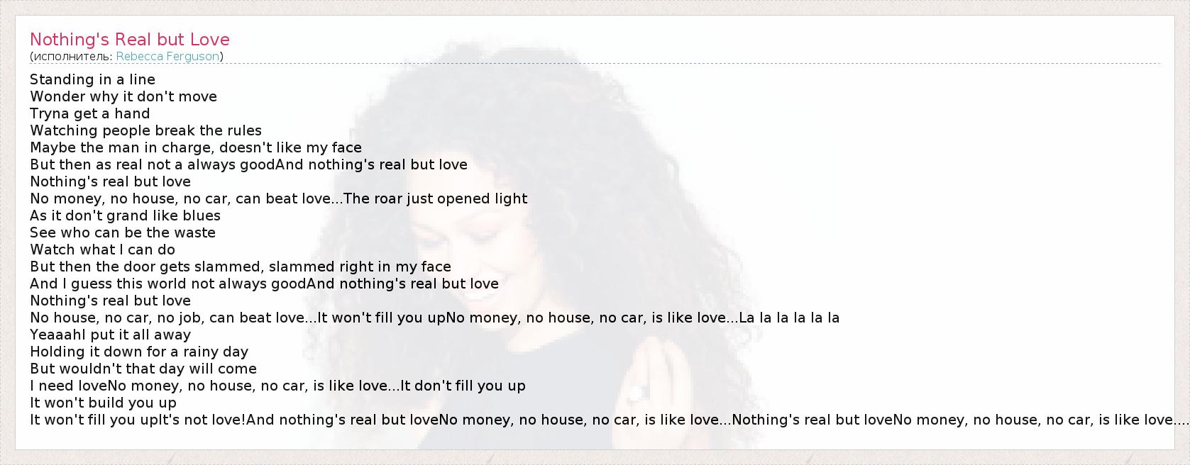 It won't fill you upIt's not love!And nothing's real but loveNo money, no house, no car, is like love...Nothing's real but loveNo money, no house, no car, is like love....