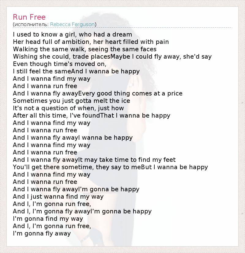 I used to know a girl, who had a dream Her head full of ambition, her heart filled with pain Walking the same walk, seeing the same faces Wishing she could, trade placesMaybe I could fly away, she'd say Even though time's moved on, I still feel the sameAnd I wanna be happy And I wanna find my way And I wanna run free And I wanna fly awayEvery good thing comes at a price Sometimes you just gotta melt the ice It's not a question of when, just how After all this time, I've foundThat I wanna be happy And I wanna find my way And I wanna run free And I wanna fly awayI wanna be happy And I wanna find my way And I wanna run free And I wanna fly awayIt may take time to find my feet You'll get there sometime, they say to meBut I wanna be happy And I wanna find my way And I wanna run free And I wanna fly awayI'm gonna be happy And I just wanna find my way And I, I'm gonna run free, And I, I'm gonna fly awayI'm gonna be happy I'm gonna find my way And I, I'm gonna run free, I'm gonna fly away