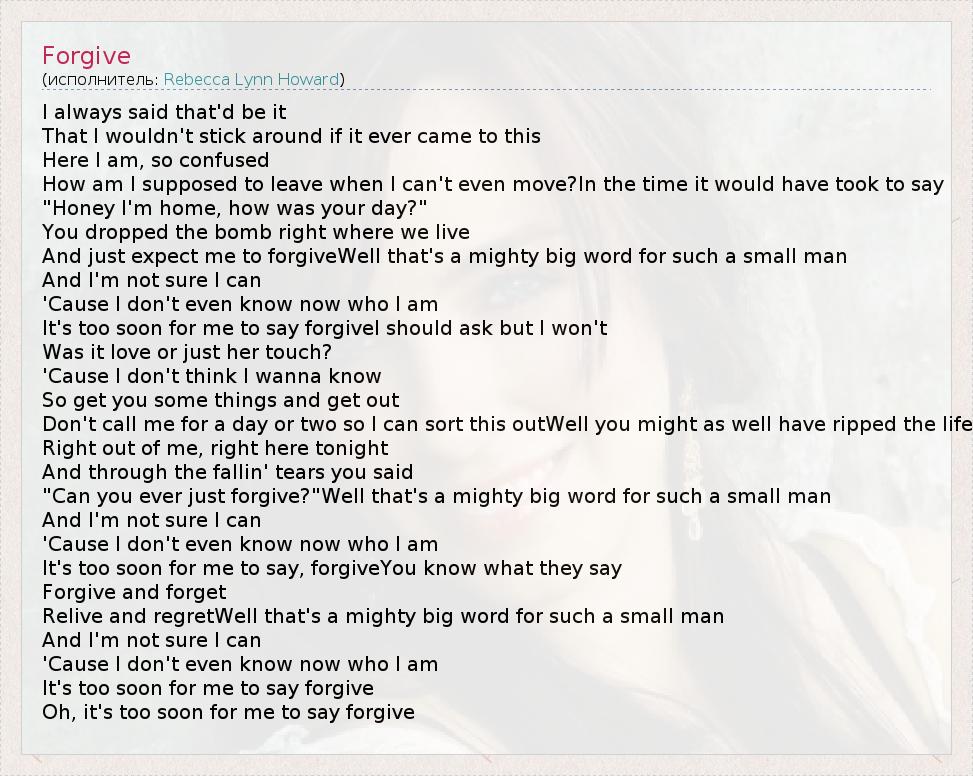 I always said that'd be it That I wouldn't stick around if it ever came to this Here I am, so confused How am I supposed to leave when I can't even move?In the time it would have took to say "Honey I'm home, how was your day?" You dropped the bomb right where we live And just expect me to forgiveWell that's a mighty big word for such a small man And I'm not sure I can 'Cause I don't even know now who I am It's too soon for me to say forgiveI should ask but I won't Was it love or just her touch? 'Cause I don't think I wanna know So get you some things and get out Don't call me for a day or two so I can sort this outWell you might as well have ripped the life Right out of me, right here tonight And through the fallin' tears you said "Can you ever just forgive?"Well that's a mighty big word for such a small man And I'm not sure I can 'Cause I don't even know now who I am It's too soon for me to say, forgiveYou know what they say Forgive and forget Relive and regretWell that's a mighty big word for such a small man And I'm not sure I can 'Cause I don't even know now who I am It's too soon for me to say forgive Oh, it's too soon for me to say forgive