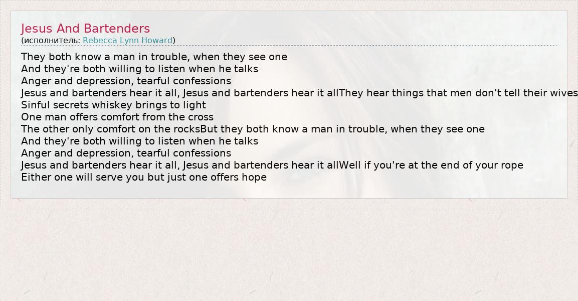 They both know a man in trouble, when they see one And they're both willing to listen when he talks Anger and depression, tearful confessions Jesus and bartenders hear it all, Jesus and bartenders hear it allThey hear things that men don't tell their wives Sinful secrets whiskey brings to light One man offers comfort from the cross The other only comfort on the rocksBut they both know a man in trouble, when they see one And they're both willing to listen when he talks Anger and depression, tearful confessions Jesus and bartenders hear it all, Jesus and bartenders hear it allWell if you're at the end of your rope Either one will serve you but just one offers hope