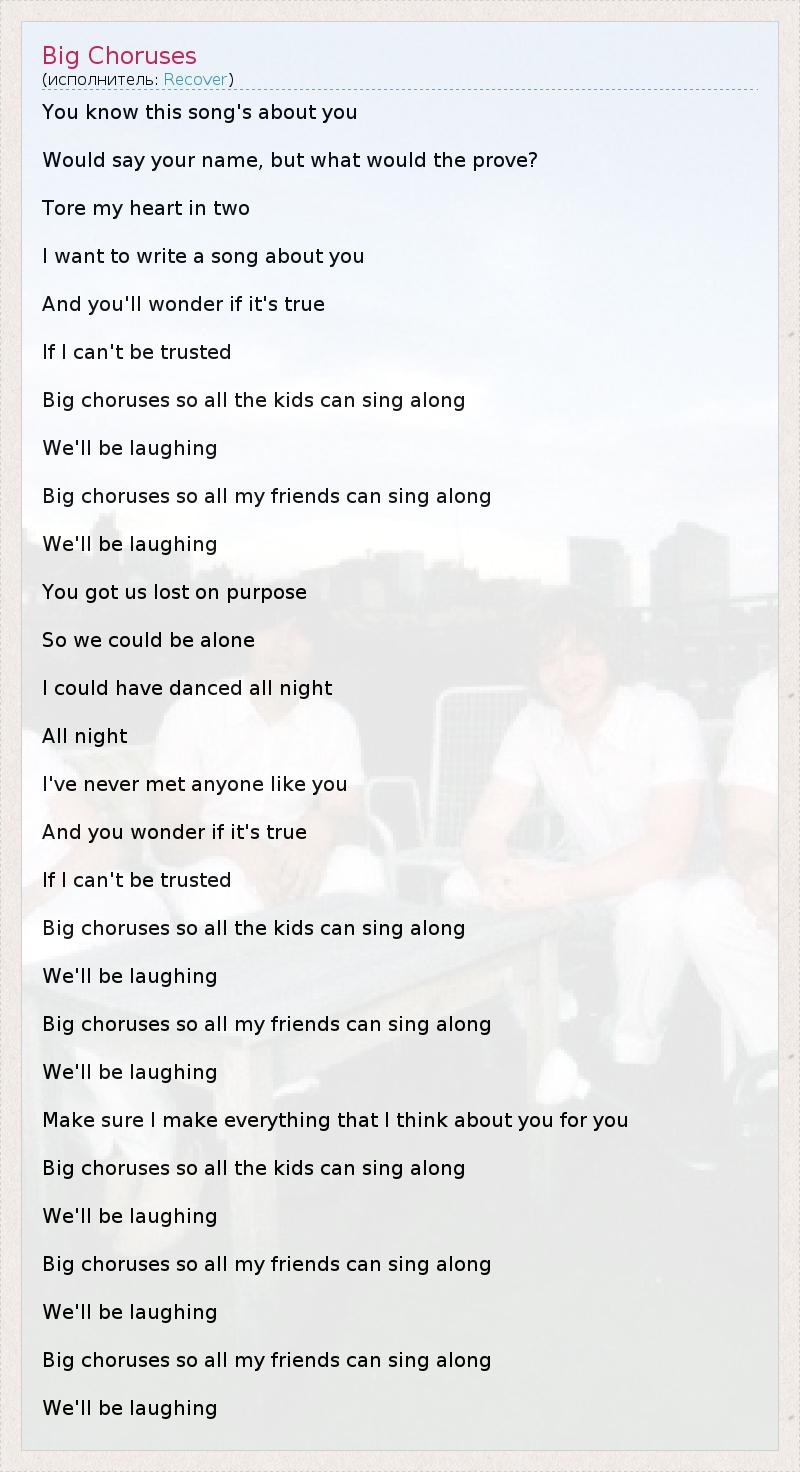 You know this song's about you Would say your name, but what would the prove? Tore my heart in two I want to write a song about you And you'll wonder if it's true If I can't be trusted Big choruses so all the kids can sing along We'll be laughing Big choruses so all my friends can sing along We'll be laughing You got us lost on purpose So we could be alone I could have danced all night All night I've never met anyone like you And you wonder if it's true If I can't be trusted Big choruses so all the kids can sing along We'll be laughing Big choruses so all my friends can sing along We'll be laughing Make sure I make everything that I think about you for you Big choruses so all the kids can sing along We'll be laughing Big choruses so all my friends can sing along We'll be laughing Big choruses so all my friends can sing along We'll be laughing