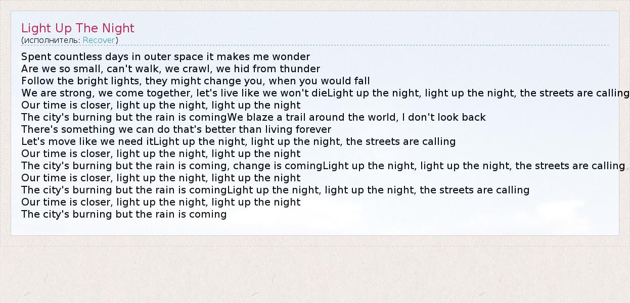 Spent countless days in outer space it makes me wonder Are we so small, can't walk, we crawl, we hid from thunder Follow the bright lights, they might change you, when you would fall We are strong, we come together, let's live like we won't dieLight up the night, light up the night, the streets are calling Our time is closer, light up the night, light up the night The city's burning but the rain is comingWe blaze a trail around the world, I don't look back There's something we can do that's better than living forever Let's move like we need itLight up the night, light up the night, the streets are calling Our time is closer, light up the night, light up the night The city's burning but the rain is coming, change is comingLight up the night, light up the night, the streets are calling Our time is closer, light up the night, light up the night The city's burning but the rain is comingLight up the night, light up the night, the streets are calling Our time is closer, light up the night, light up the night The city's burning but the rain is coming