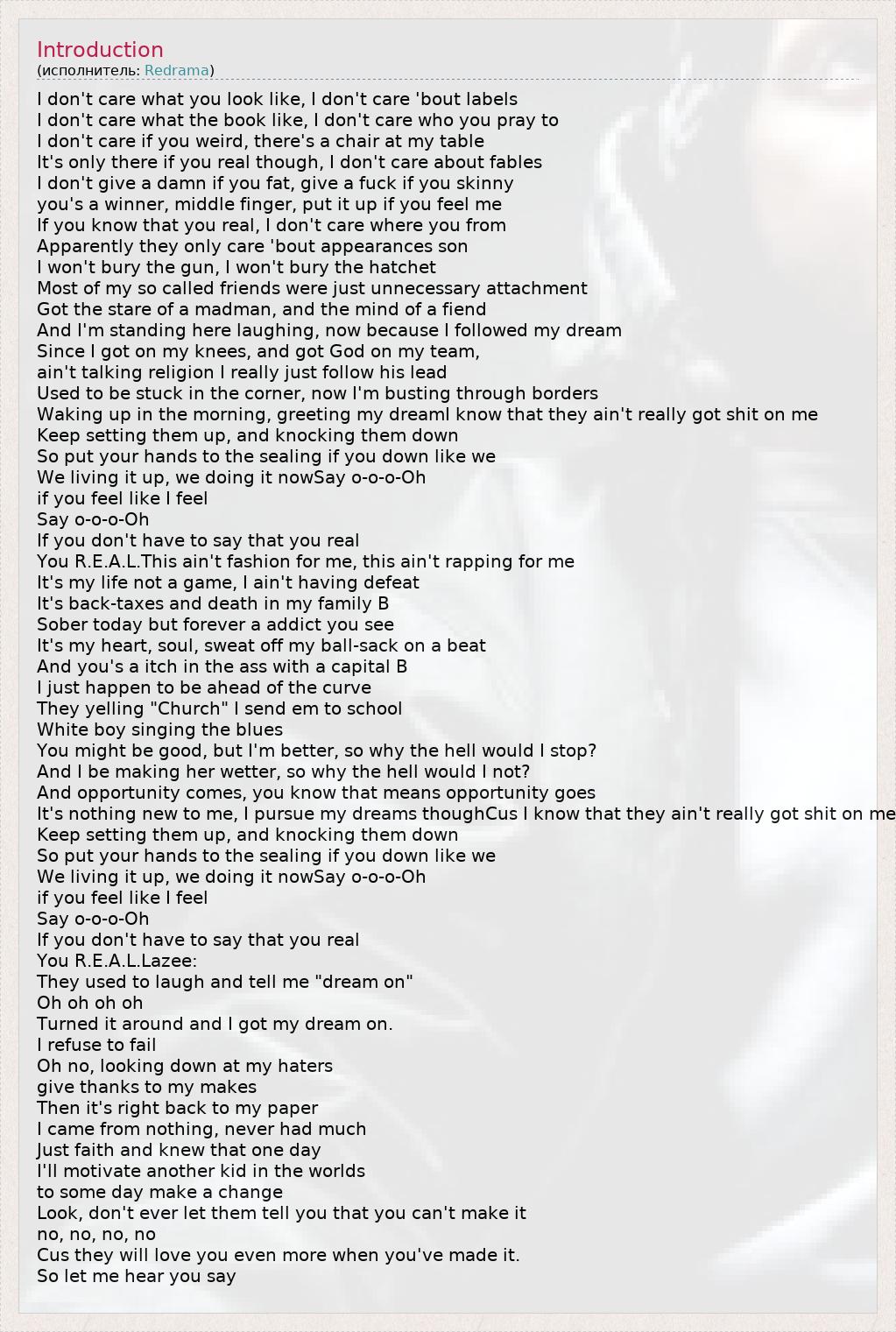 Это интересно:Lasse Mellberg (born 1977 Helsinki, Finland), better known by his stage name Redrama, is a Finland-Swedish rapper. Redrama made a breakthrough in 2003. English occurring Redrama was part of hip-hop group Alien Allies, which also included the Norwegian Paperboys and Madcon. Redrama won the English-language Finnish championship of rapping in 2001. He won the finnish Grammy (Emma) award for best hiphop album in 2005. He's worked together with such artists as Madcon(Nor), Proof (of D12), Promoe, Pato Pooh (Swe), Anna Abreu, Asa, Paleface, Felix Zenger to name a few.